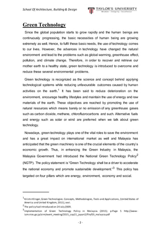 This document is a student assignment on green technology submitted to Dr. Kam. It consists of 2,165 words with 2,015 words without references. The assignment discusses green technology and ways to enhance its use, specifically looking at solar air conditioning systems and chilled water systems. Solar air conditioning can provide cooling with lower fossil fuel energy usage and no harmful emissions. Chilled water systems are increasingly used for large buildings like malls due to their cost savings and not requiring refrigerant lines throughout a building. The student provides components of each system and their advantages in enhancing green technology.