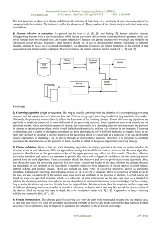 This document summarizes a research paper on clustering algorithms in data mining. It begins by defining clustering as an unsupervised learning technique that organizes unlabeled data into groups of similar objects. The document then reviews different types of clustering algorithms and methods for evaluating clustering results. Key steps in clustering include feature selection, algorithm selection, and cluster validation to assess how well the derived groups represent the underlying data structure. A variety of clustering algorithms exist and must be chosen based on the problem characteristics.
