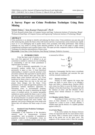 This document provides a survey of data mining techniques for crime prediction. It begins with an introduction to crime prediction and standard techniques like centrography, journey to crime, routine activity theory, and circle theory. It then discusses various data mining techniques used for crime prediction, including support vector machines, multivariate time series clustering, Bayesian networks, artificial neural networks, and fuzzy time series. For each technique, an example paper applying that technique is summarized. A table provides a comparative analysis of the techniques based on predictive accuracy, performance, and disadvantages. The document concludes that the discussed data mining prediction techniques can enhance accuracy and performance of crime prediction by identifying patterns in current and past crime data to predict future values.