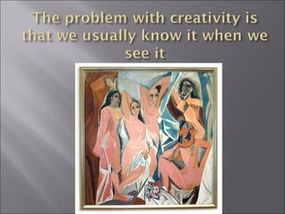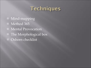 The document discusses various techniques for developing creativity and solving problems in an intellectual manner. It suggests trying new things without criticism, getting into a creative mood, resting, thinking in shapes, making everything a play, focusing, making drawings, finding new business ideas, making logos, organizing parties, and developing existing ideas. It states that creative techniques help overcome mental barriers and quotes Edward de Bono's concept of creativity being like a flowing river through mental leaps. Some specific techniques mentioned are mind mapping, the 365 method of mental provocation, morphological boxes, and Osborn's checklist.