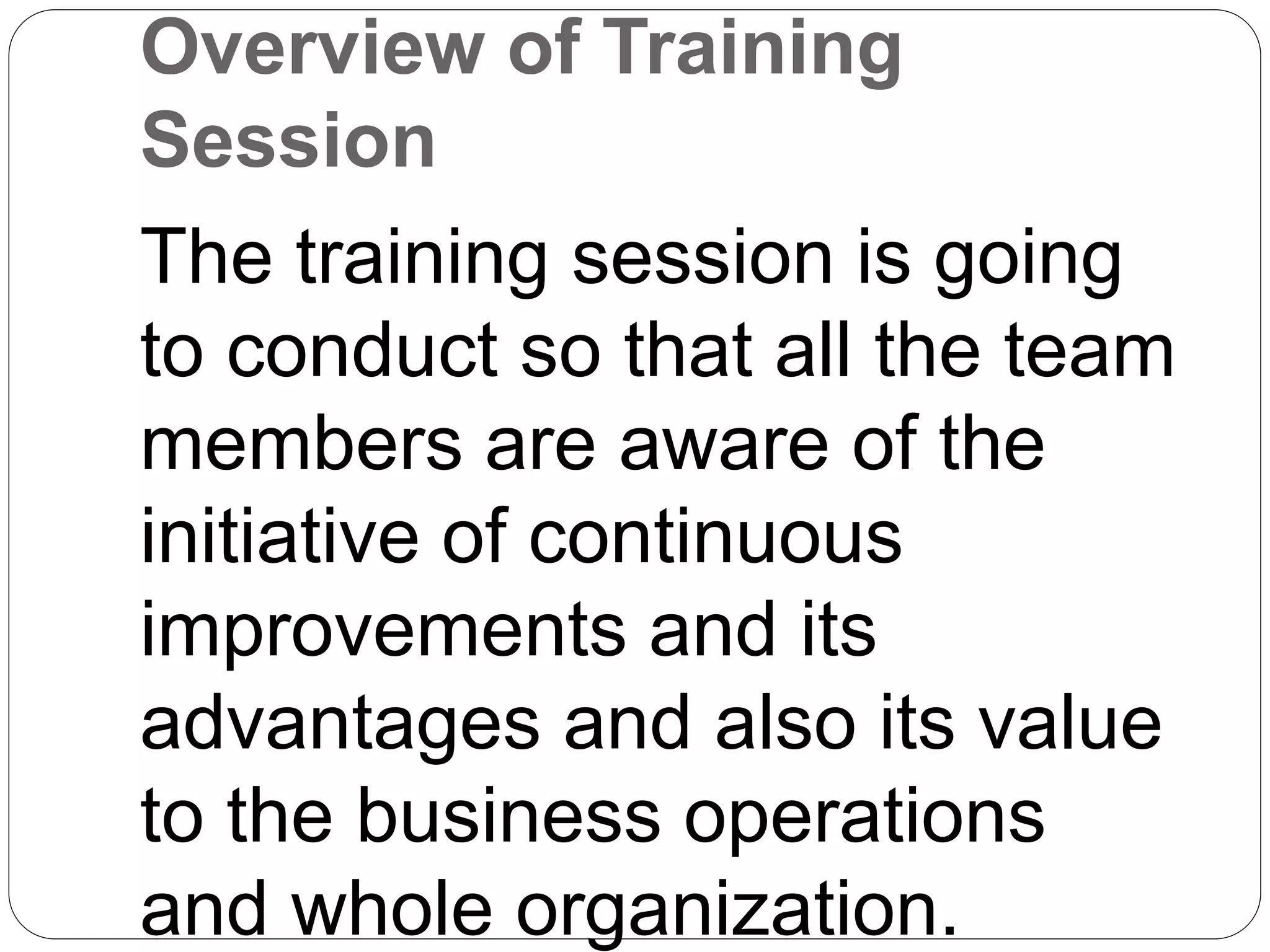 The training session aims to inform team members about continuous improvement initiatives and their benefits to business operations. Key points include an overview of continuous improvement, its advantages, and the current policy at MMI along with proposed improvements. The session emphasizes the value of these processes to the organization.