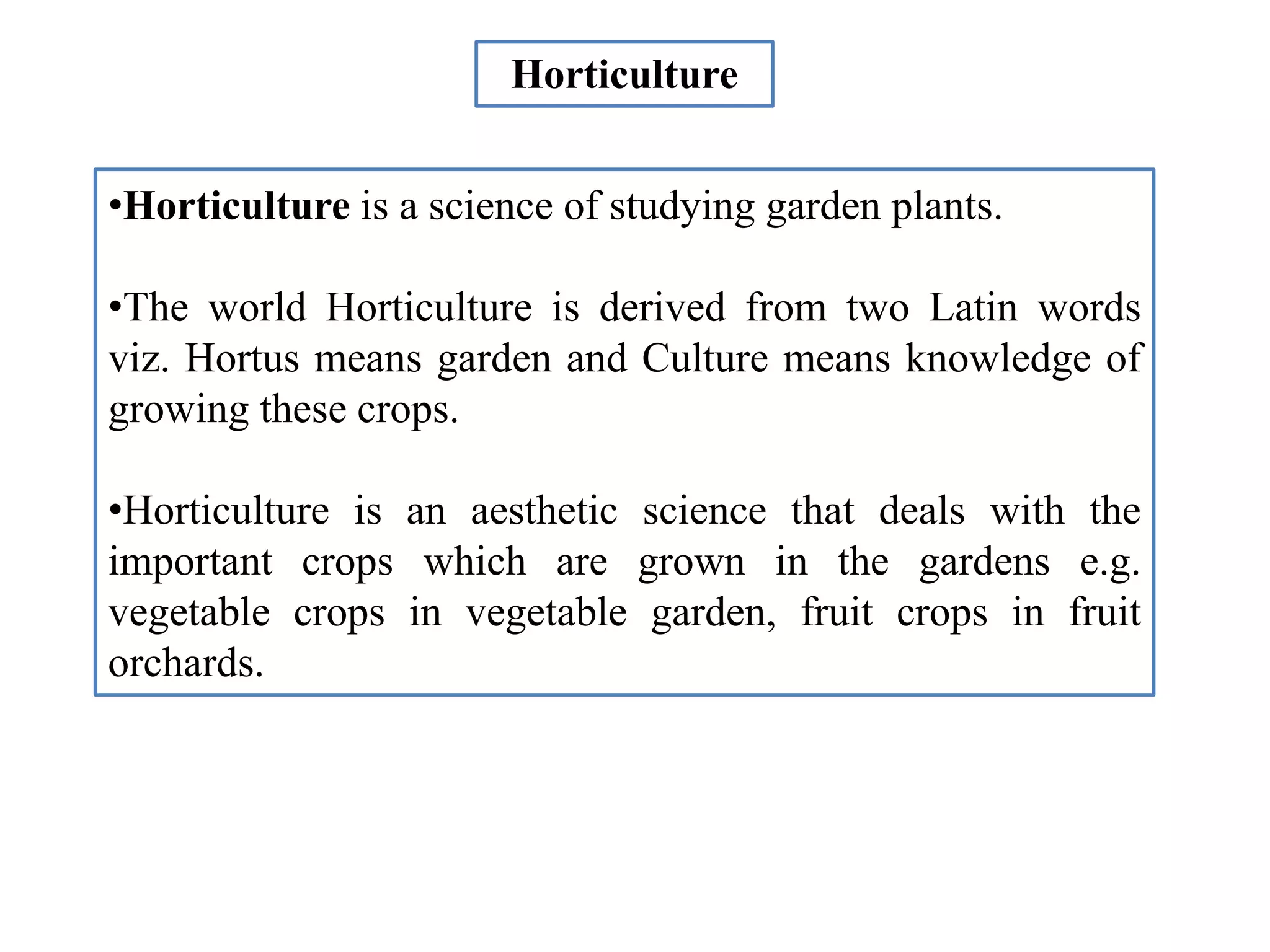 This document provides information about the principles of horticulture. It defines horticulture as the science of studying garden plants, and notes that it deals with important crops grown in gardens, such as vegetables and fruits. The document outlines several benefits of horticulture, including higher yields per unit area, nutritional benefits, beautification, and suitability for small farmers. It also discusses the scope and importance of horticulture in India due to varied climates, irrigation, and growing markets and demand. The main branches of horticulture - olericulture, pomology, floriculture, and post-harvest technology - are also summarized.