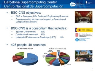 The document outlines the goals and functions of the Barcelona Supercomputing Center (BSC), which focuses on R&D in various scientific fields and provides supercomputing services to researchers in Spain and Europe. It details BSC's collaborative efforts, technological advancements, including the development of data frameworks like DataClay, and initiatives to enhance energy efficiency in future supercomputers. The document also highlights the integration of persistent data with programming models to facilitate more efficient computational processes.