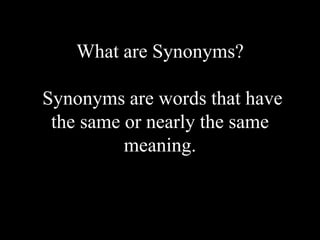 Synonyms are words that have the same or nearly the same meaning. The document provides examples of synonyms for different parts of speech including nouns like annihilation/destruction and adjectives like fertile/fruitful/abundant. It also lists references for additional information on synonyms.