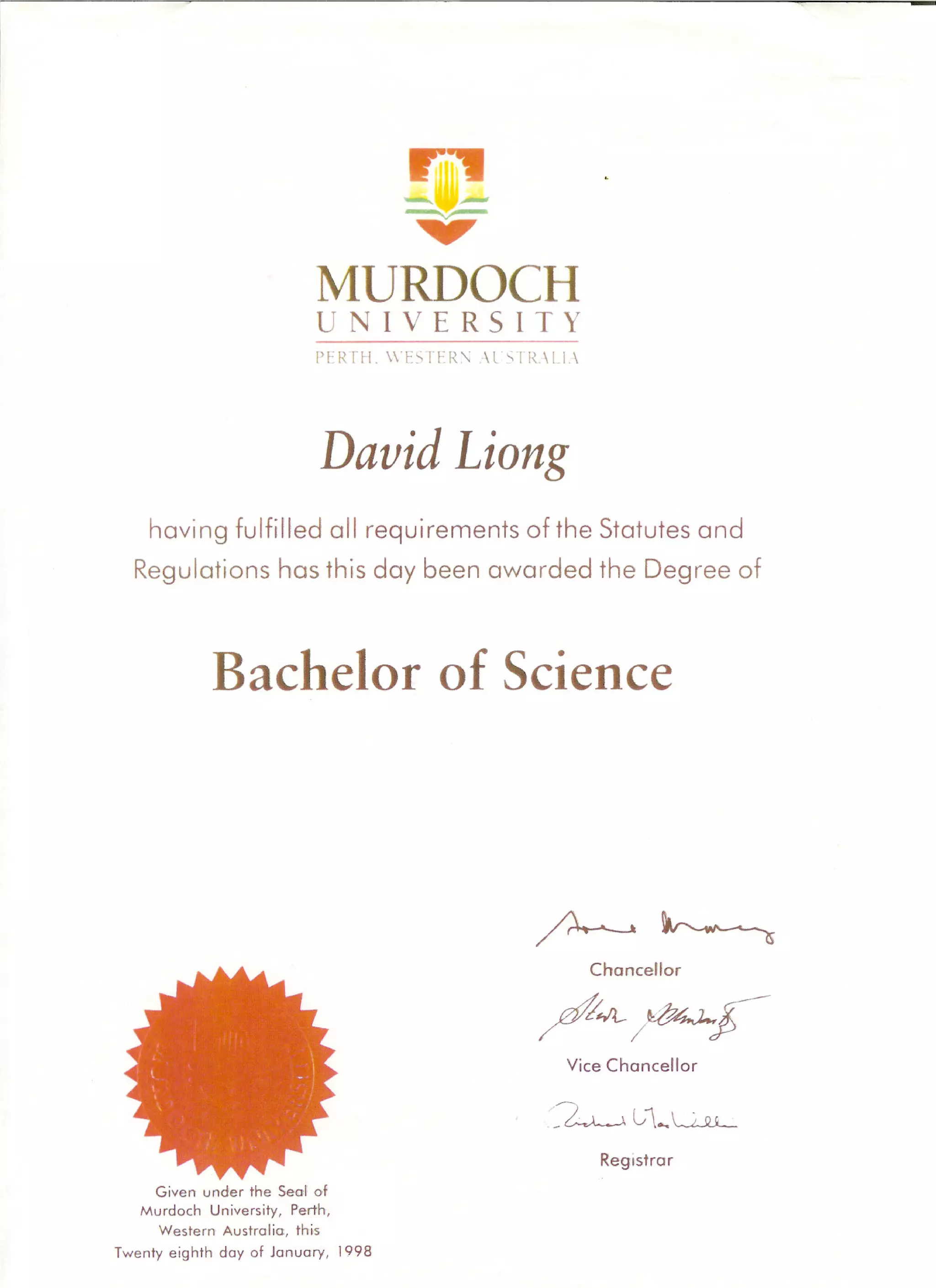 Murdoch University awarded David Liong the degree of Bachelor of Science on January 28, 1998. The document confirms that Liong fulfilled all the requirements of the statutes and regulations of Murdoch University. It was signed by the Chancellor, Vice Chancellor, and Registrar and bears the seal of Murdoch University in Perth, Western Australia.