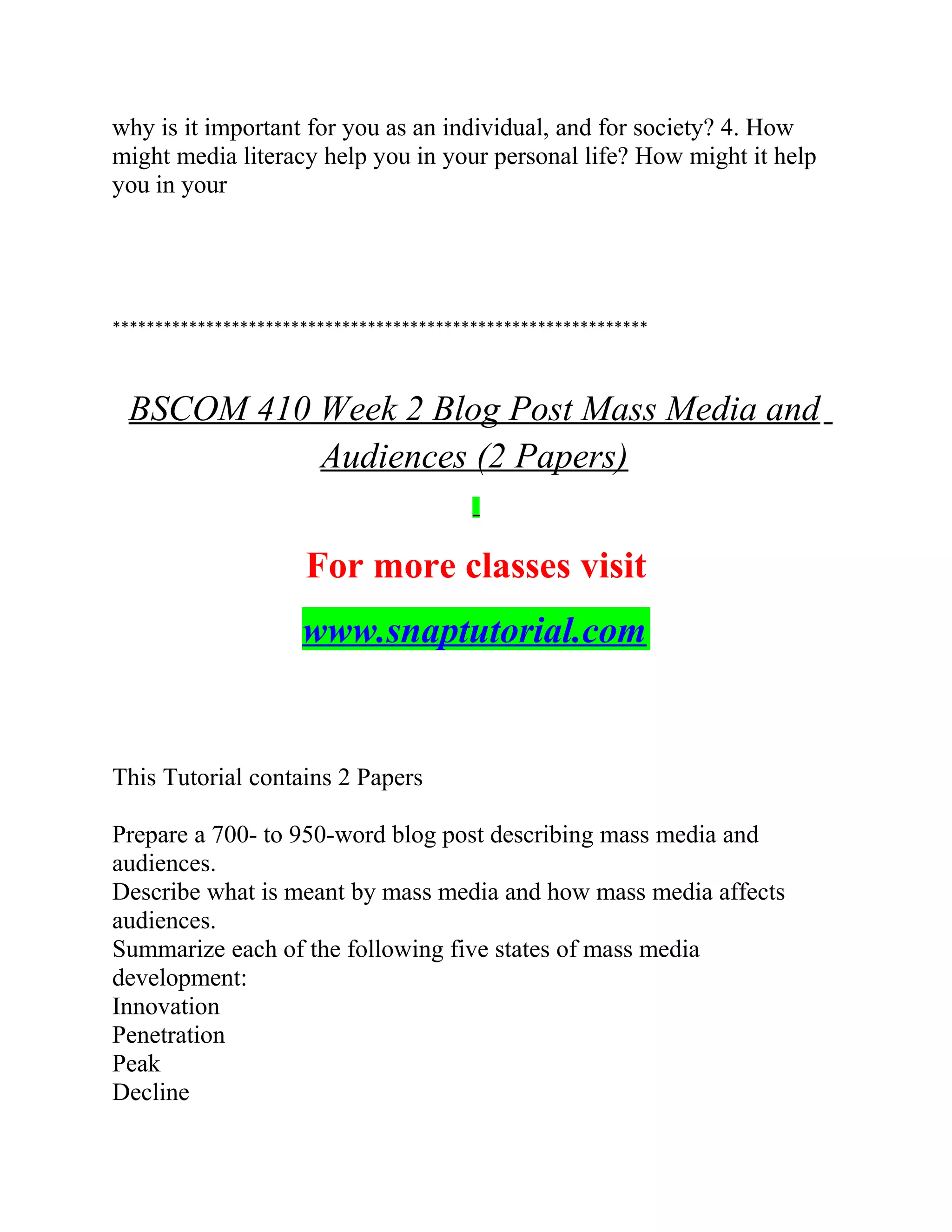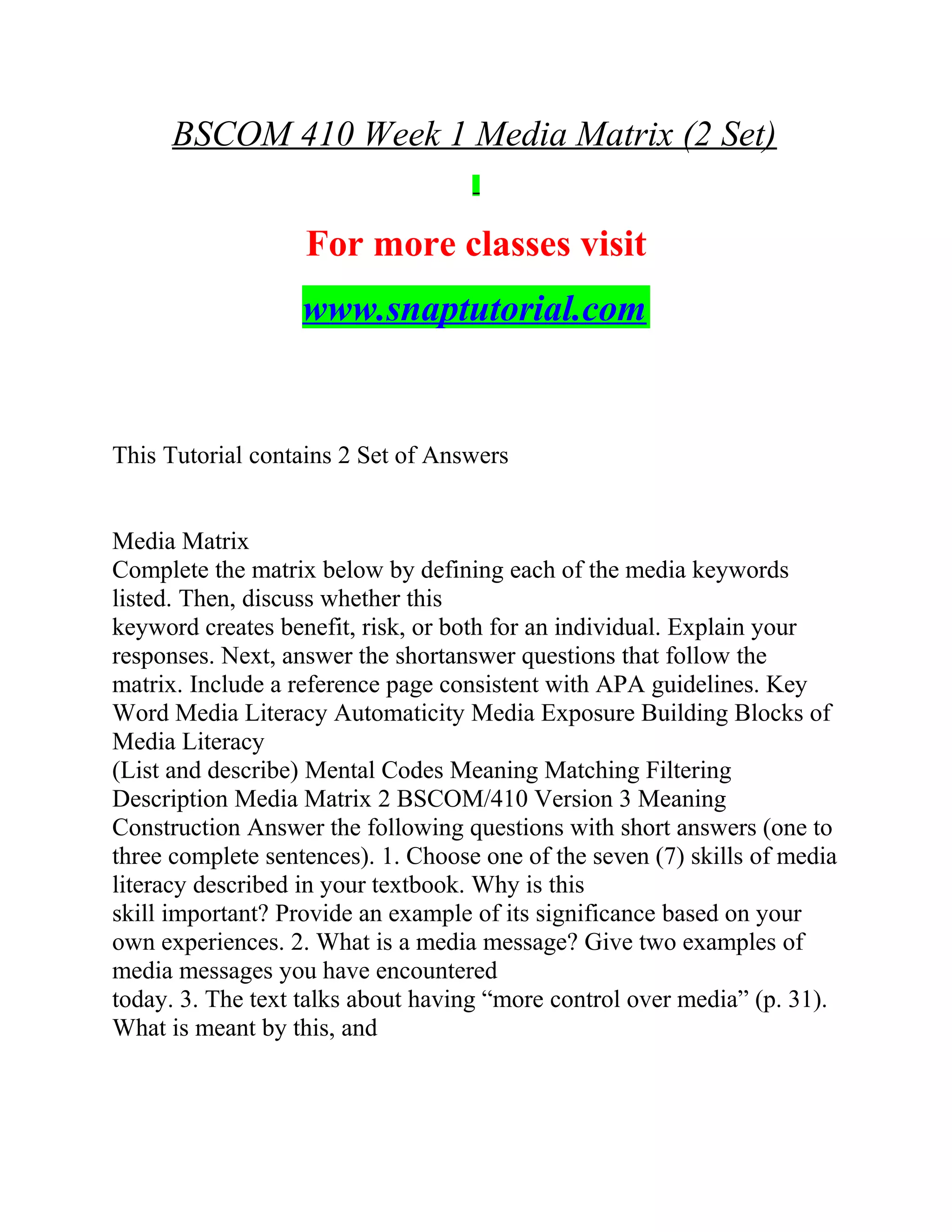 The document is an extensive outline for a series of BScom 410 courses, detailing various assignments focused on media literacy, mass media effects, and the roles of media in society. Key assignments include creating media matrices, analyzing mass media and audiences, examining media effects through case studies, and discussing hot-button issues like the portrayal of sex and violence in media. Throughout the assignments, students are encouraged to apply APA guidelines, conduct research, and reflect on their personal media consumption experiences.
