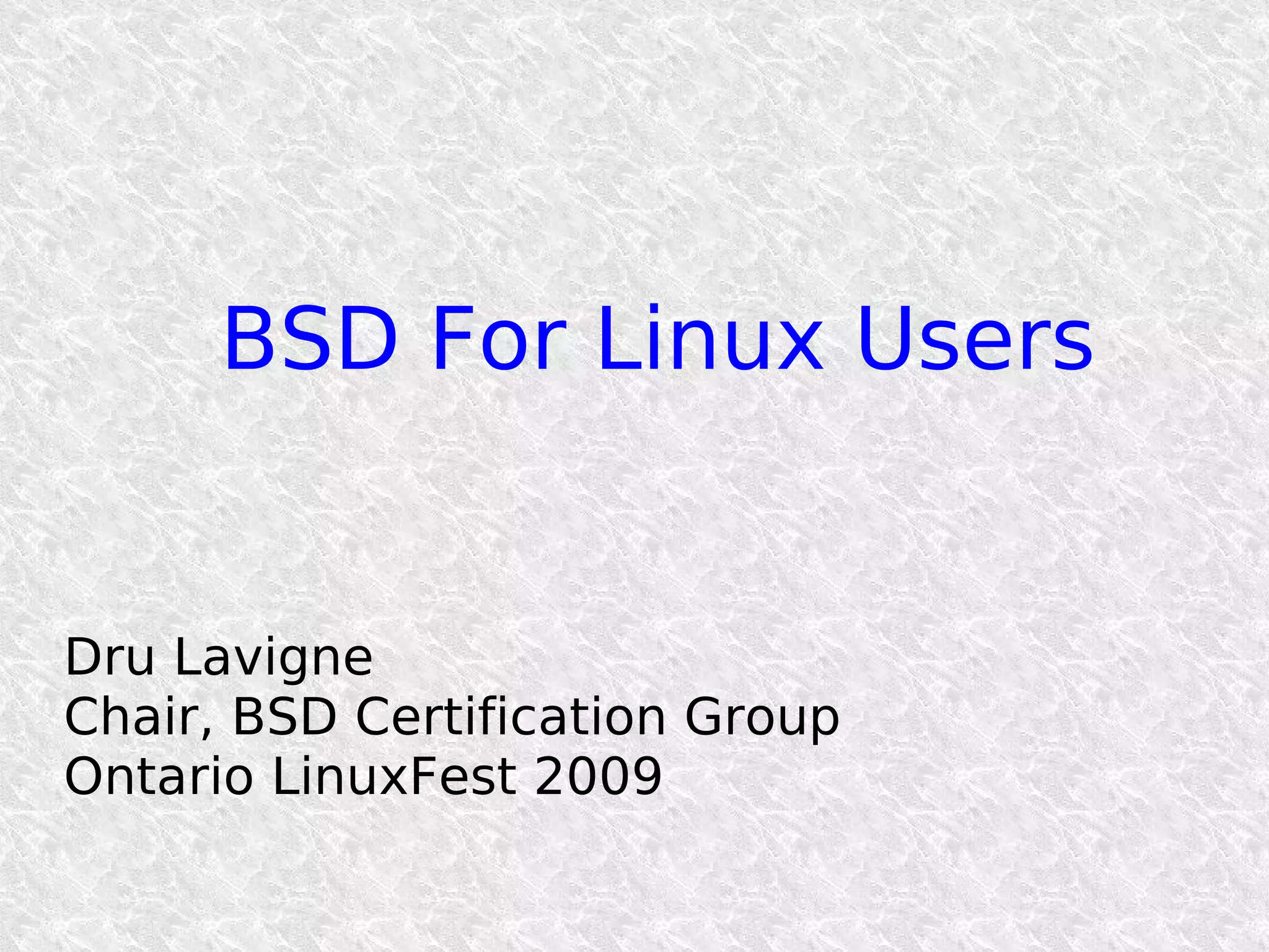 This presentation provides an overview of BSD operating systems for Linux users. It begins with a brief introduction to the different BSD projects, including their focuses. It then discusses how BSD differs from Linux in areas like desktop environments, device naming, startup processes, and release engineering. The presentation highlights several unique features of BSD like jails, packages, security tools, and filesystem technologies. It concludes by recommending several books for learning more about BSD and inviting questions.