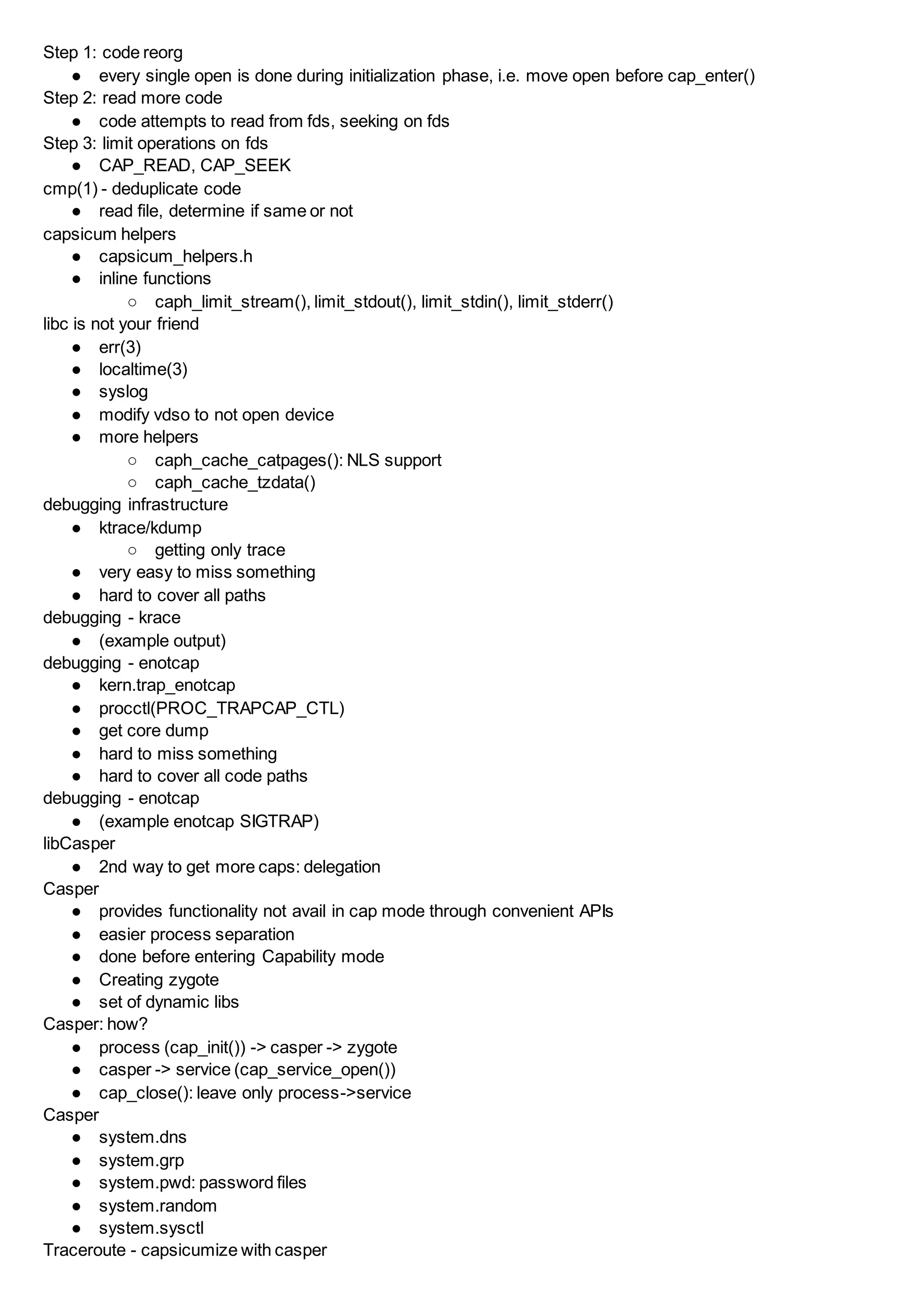 This document discusses the Capsicum capability model and its use in sandboxing systems in FreeBSD. Capsicum allows tight sandboxing by limiting access when a process enters capability mode using cap_enter(). It describes debugging capabilities like ktrace and enotcap. It also introduces Casper, which provides additional capabilities through delegation before entering capability mode. Casper allows easier process separation by creating services run with user privileges that processes can then securely access through APIs. The document outlines several system services implemented through Casper and future work integrating it more fully with libc and sandboxing additional system services.