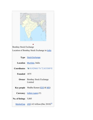 The Bombay Stock Exchange (BSE) is located in Mumbai, India and is the oldest stock exchange in Asia, founded in 1875. It has over 5,085 listed companies and a market capitalization of over $1.63 trillion. The BSE is home to the SENSEX index, which tracks the performance of 30 large companies across key sectors. Though it has a similar market cap to the National Stock Exchange, the BSE has lower daily trading volumes. The BSE traces its origins back to the 1850s and operates trading sessions each day except weekends and holidays.