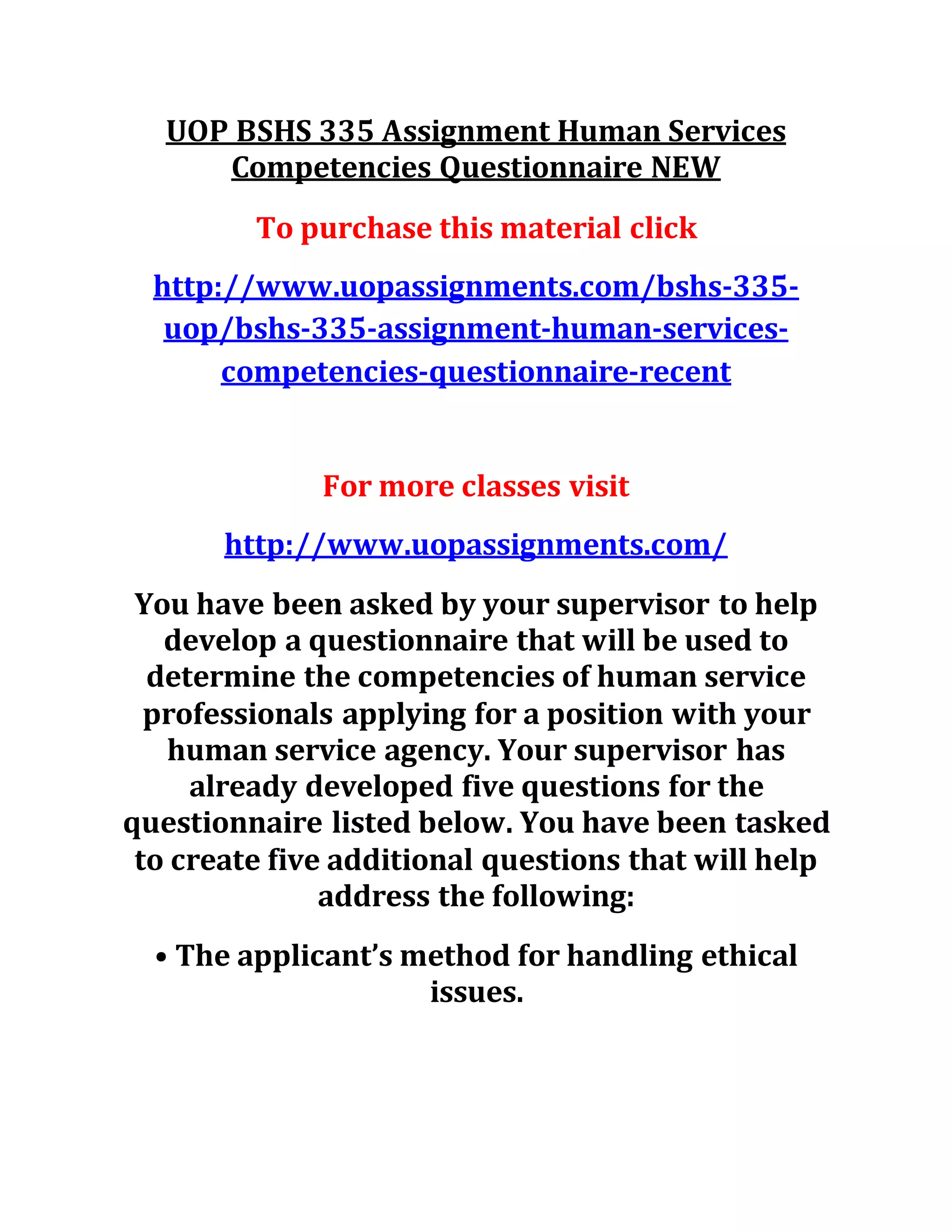 The document outlines assignments related to competency assessment for human service professionals, focusing on ethical decision-making and adherence to professional codes of ethics. It requires the development of questionnaires, comparative charts on ethical standards, case studies, and self-evaluations that emphasize understanding and application of ethics in practice. Additionally, it discusses the importance of continuous education, multicultural competence, and supervision in human services.