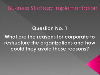 Organizational restructuring aims to make companies work more effectively and efficiently through changes like downsizing, acquisitions, mergers, and strategic alliances. Restructuring strategies are used by organizations to improve performance, enter new markets, gain competitive advantages, and increase profits. Common reasons for restructuring include changes in competitive environments, markets, government policies, and the need for new skills or reduced costs.