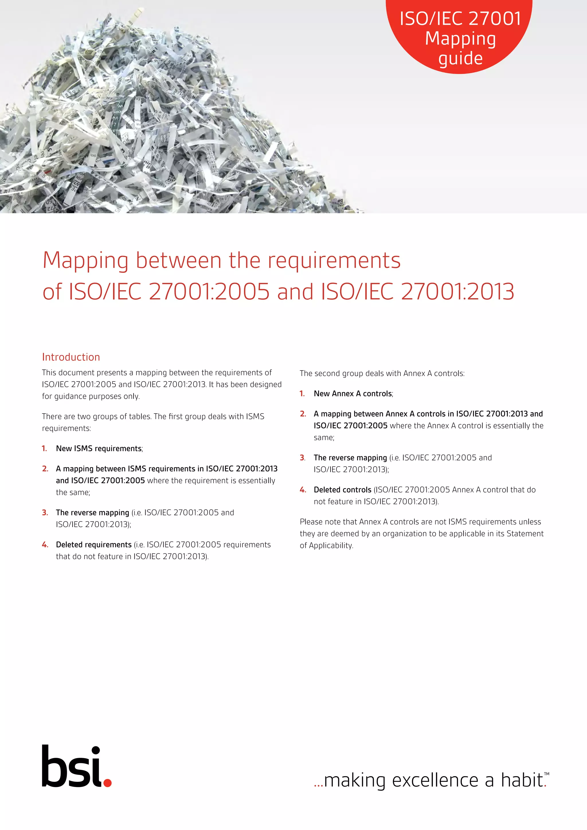 This document provides a mapping between the requirements of ISO/IEC 27001:2005 and ISO/IEC 27001:2013. It includes tables that map the ISMS requirements and Annex A controls between the two versions, noting new, unchanged, deleted and reverse requirements. The purpose is to provide guidance on the changes between the standards.