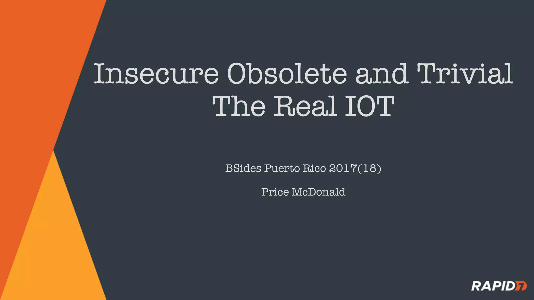 The document discusses hardware security assessments of Internet of Things (IoT) devices. It provides tips for obtaining cheap IoT devices, identifying device components, interfacing with devices using logic analyzers and hardware debugging tools, extracting file systems, and performing reverse engineering. Methods covered include identifying interfaces like UART and JTAG, using tools like Saleae Logic, Bus Pirate, Shikra, and OpenOCD, and reversing binaries with tools like Binary Ninja, IDA Pro, and Radare2.