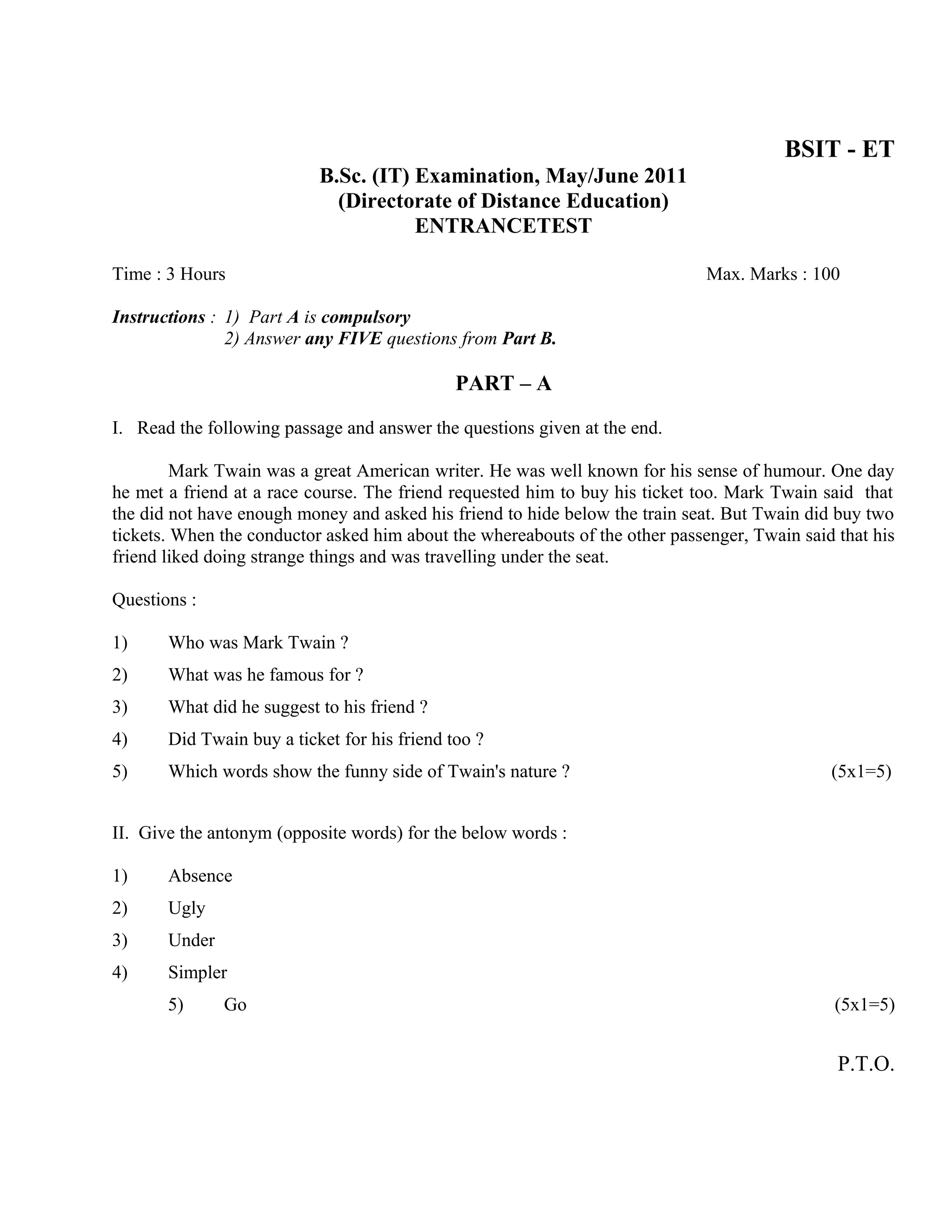 1) This document contains an entrance test for the B.Sc. (IT) Examination from May/June 2011 conducted by the Directorate of Distance Education.