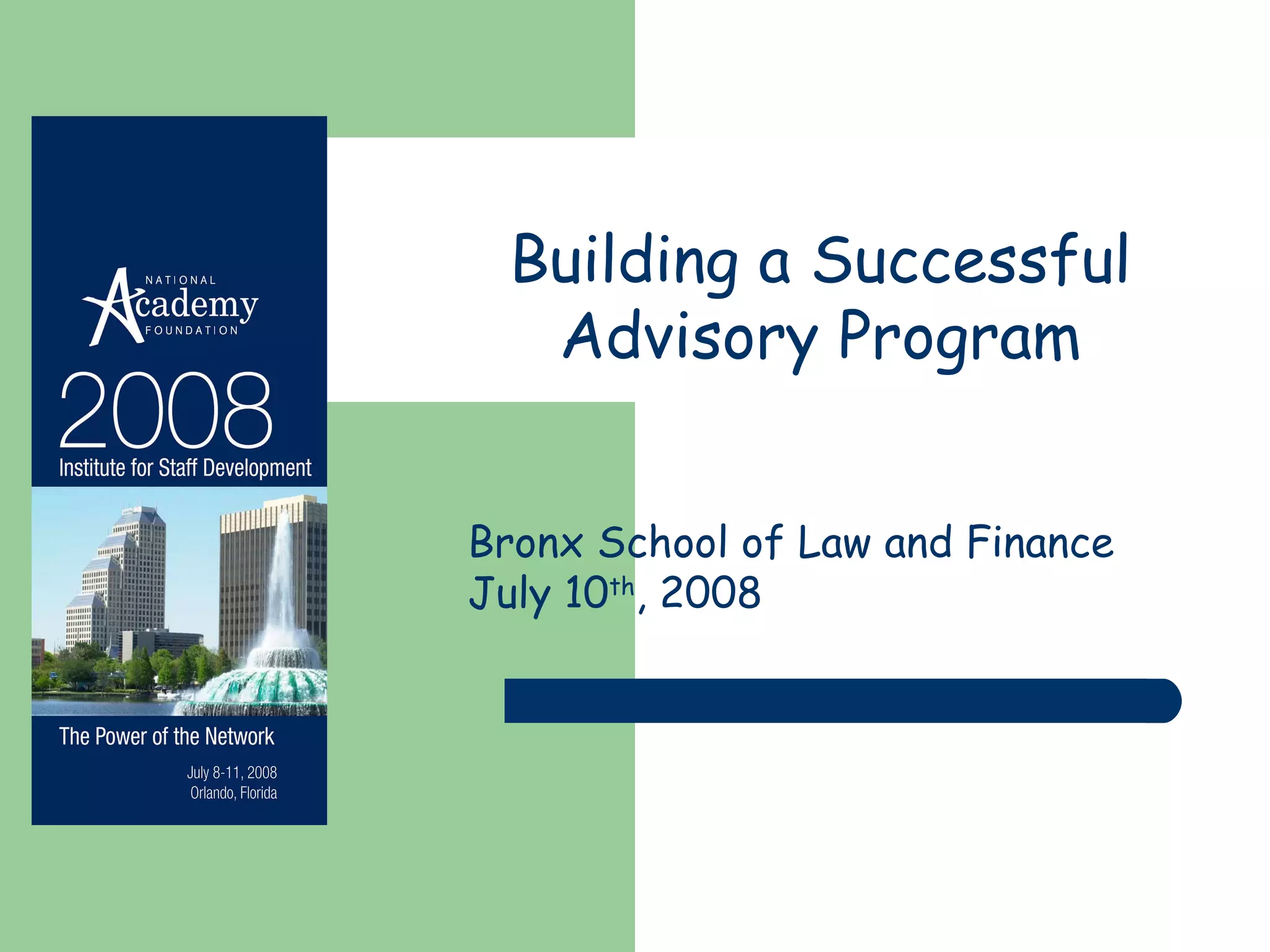 The document outlines the goals and structure of an advisory program at the Bronx School of Law and Finance. The advisory program aims to create a small, personal learning environment where students stay with the same advisor for all four years of high school. Advisors meet with students daily for 30 minutes and serve as the primary contact with families. Challenges include ensuring buy-in from teachers and a common vision, while benefits include developing community, accountability, and ensuring every student has an adult advocate. The school aims to strengthen the program by emphasizing their common vision and developing a standard curriculum.