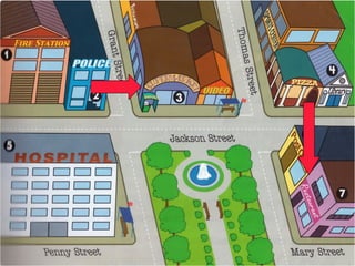The document provides directions and discusses locations. It includes a conversation where Matt gives Jesse directions to the supermarket, newspaper stand, and other nearby places. The vocabulary focuses on prepositions of location like on, near, next, and across. Students then answer true/false questions about the conversation and locations. At the end, they are prompted to do a role-play giving directions to an Italian restaurant located across the street from the supermarket.