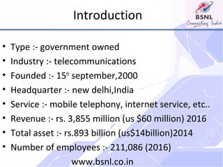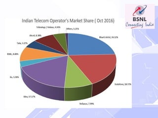 BSNL is a government-owned telecommunications company headquartered in New Delhi, India. It has over 211,000 employees and provides mobile, internet, landline, and other telecom services across India. While BSNL has a large customer base and resources, it faces threats from private competitors and decreasing revenues due to competitive pricing pressures. BSNL aims to provide affordable telecom services and infrastructure to help develop India's economy.