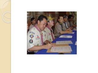 The document discusses the philosophy and principles of Scout advancement. It explains that advancement aims to help Scouts develop physically, morally, socially and spiritually through a progressive series of activities and challenges. As Scouts master new skills, they are recognized through badges and ranks. The document emphasizes that advancement should be integrated into the normal Scouting program and be a natural outcome of participation, not just through tests. Adults play an important role by planning activities that allow Scouts to work on requirements and providing support and encouragement.