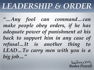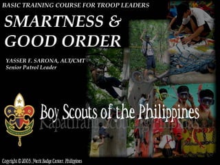 The document outlines the importance of leadership and the proper use of the Boy Scouts uniform, highlighting its symbolism and guidelines for wearing it during various scouting activities. It emphasizes the values of character, preparedness, and service embodied in the uniform, while also detailing appropriate settings for its use and occasions when it should not be worn. Additionally, it provides specifications for different types of uniforms and the significance of badges and insignias within the scouting movement.