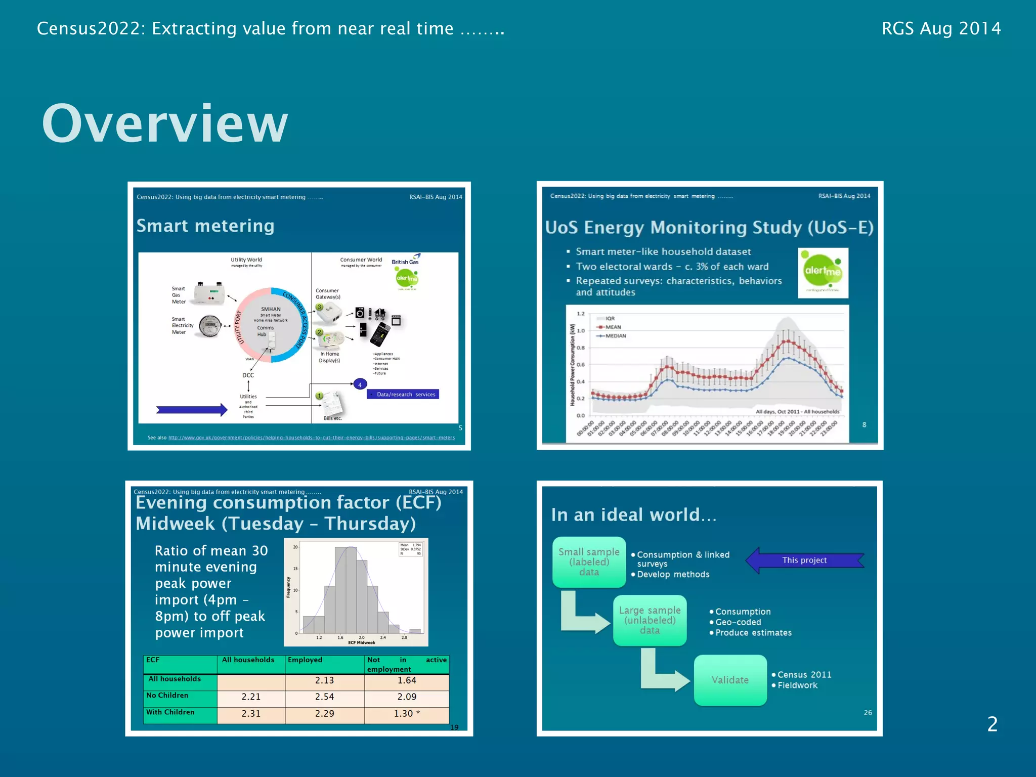 The document outlines the goals of the Census2022 project, focusing on innovative methods to utilize near real-time data, particularly from smart metering, to enhance UK census practices. It discusses the potential of smart metering data to infer household characteristics and generate more timely and cost-effective social indicators. The project aims to leverage this data to create valuable insights into household behaviors and demographics, thereby improving census accuracy and relevance.