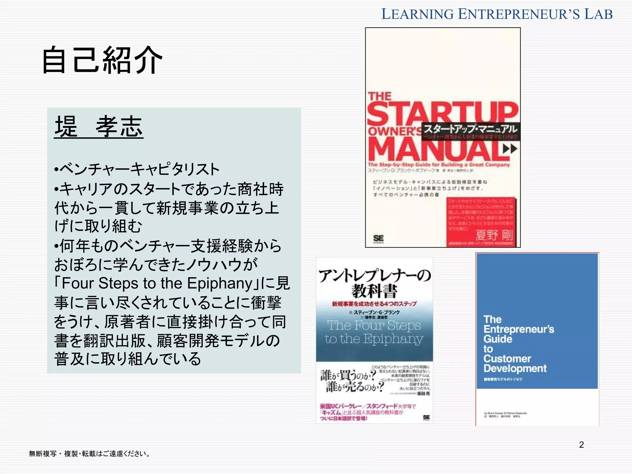 顧客開発モデルやリーンスタートアップを始めとする「本当にツカえる起業ノウハウ」を
