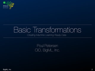 This document outlines the process of preparing machine learning-ready data, emphasizing the importance of data transformations and feature engineering. It details challenges in data structure, labeling, and the need for data cleaning and aggregation. Additionally, it provides examples of SQL commands for data management and discusses various machine learning tasks such as classification and regression.