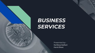 Business services are those connected to banking, transport, warehousing, insurance, and communication that help businesses run smoothly. They have key characteristics of being intangible, inconsistent, having no inventory, and requiring customer involvement. Common types of business services include banking, insurance, and postal/telecom services. Banking services include deposit accounts, loans, drafts, ATMs, and e-banking. Insurance is a contract where the insurer agrees to compensate the insured for losses from uncertain events in exchange for premium payments.