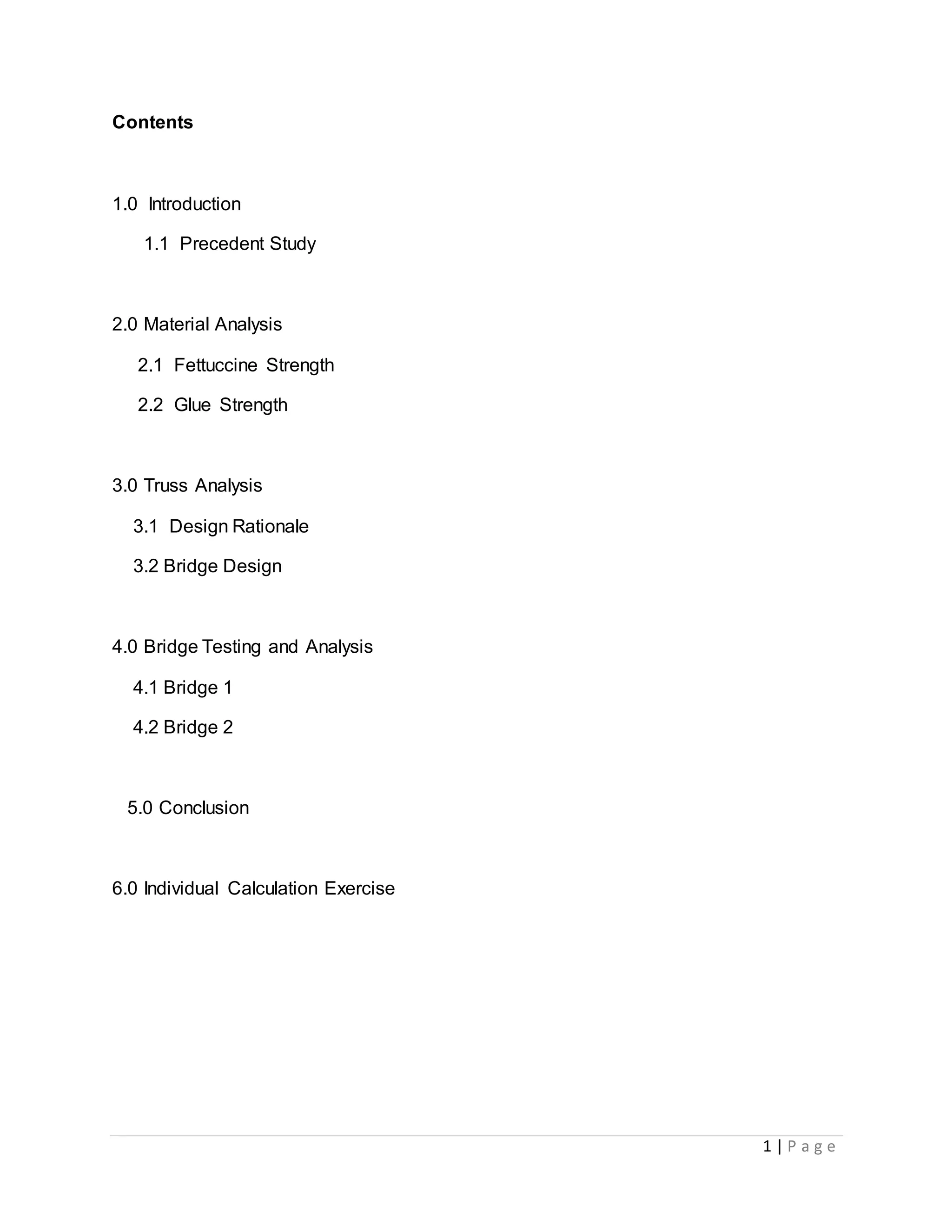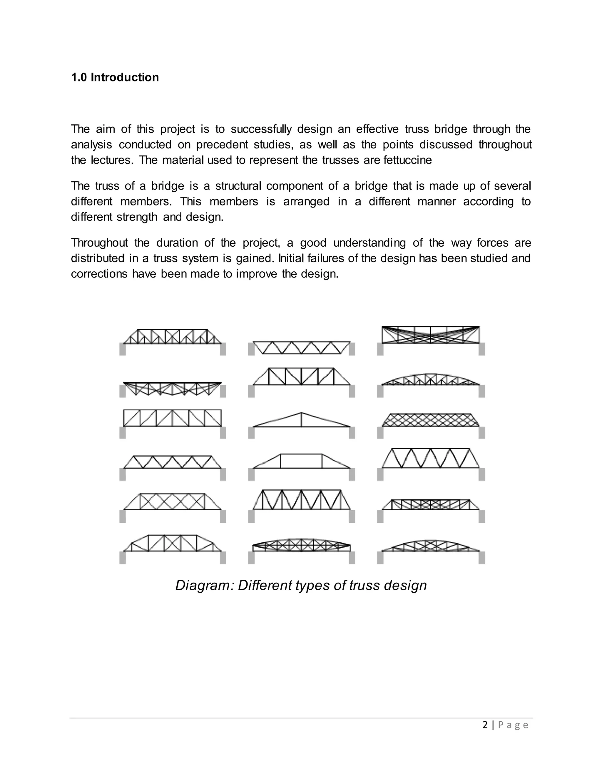 The document discusses the design and testing of two fettuccine truss bridge models. The first design was based on the Horace Wilkinson Bridge but failed structural testing. This led to a redesign with a simpler camelback truss design that emphasized strong base and top members. Testing found the second bridge could support over 3 kg before failing, showing improved efficiency over the initial design. The document provides details on the material selection, designs, force distributions, and testing results of the two bridge models.