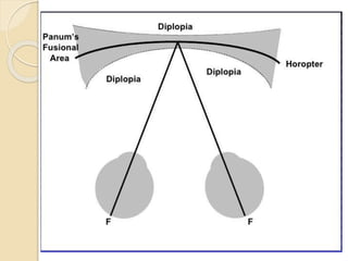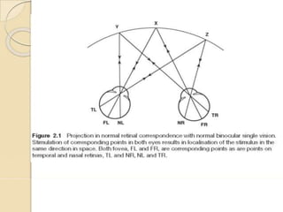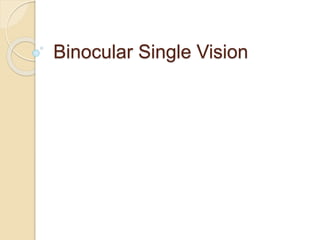 Binocular single vision allows for the blending of separate images from each eye into a composite image. It requires overlapping visual fields between the eyes, intact neural pathways, and corresponding retinal areas. The advantages of binocular vision include wider field of view, better detection of faint images, stereopsis for depth perception, and improved visual acuity. Abnormal retinal correspondence can allow limited binocular vision by pairing the fovea of one eye with a non-foveal point in the other eye.