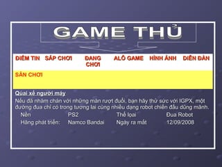 IGPX là một trò chơi đua xe robot trong tương lai, phát triển bởi Namco Bandai, được ra mắt vào ngày 12/09/2008. Trò chơi mang đến những màn rượt đuổi hấp dẫn và nhiều dạng robot chiến đấu mạnh mẽ. Nếu bạn đã nhàm chán với các trò chơi thể loại khác, IGPX có thể là một lựa chọn mới thú vị.