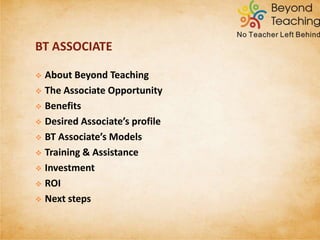 Beyond Teaching is offering an opportunity for associates to help teachers prepare for the Central Teachers Eligibility Test (CTET) with a low investment of ₹25,000, focusing on training and resources to support candidates. The mission aims to empower teachers as change agents in social improvement by expanding access to education and formal training. Associates will benefit from operational assistance and can transition to franchisees based on successful operations in an untapped market for teacher training.