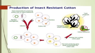 This document discusses Bt cotton, which is a genetically modified cotton variety that produces an insecticide against the bollworm pest. It was developed by Monsanto in 1987. India is a major producer of Bt cotton, ranking first in total area planted and third in production. However, India's average Bt cotton yield is lower than the world average. Bt cotton provides advantages over traditional cotton like higher yields from effective bollworm control and reduced insecticide use. It also has some disadvantages like higher costs for seeds, fertilizer, irrigation, and harvesting.