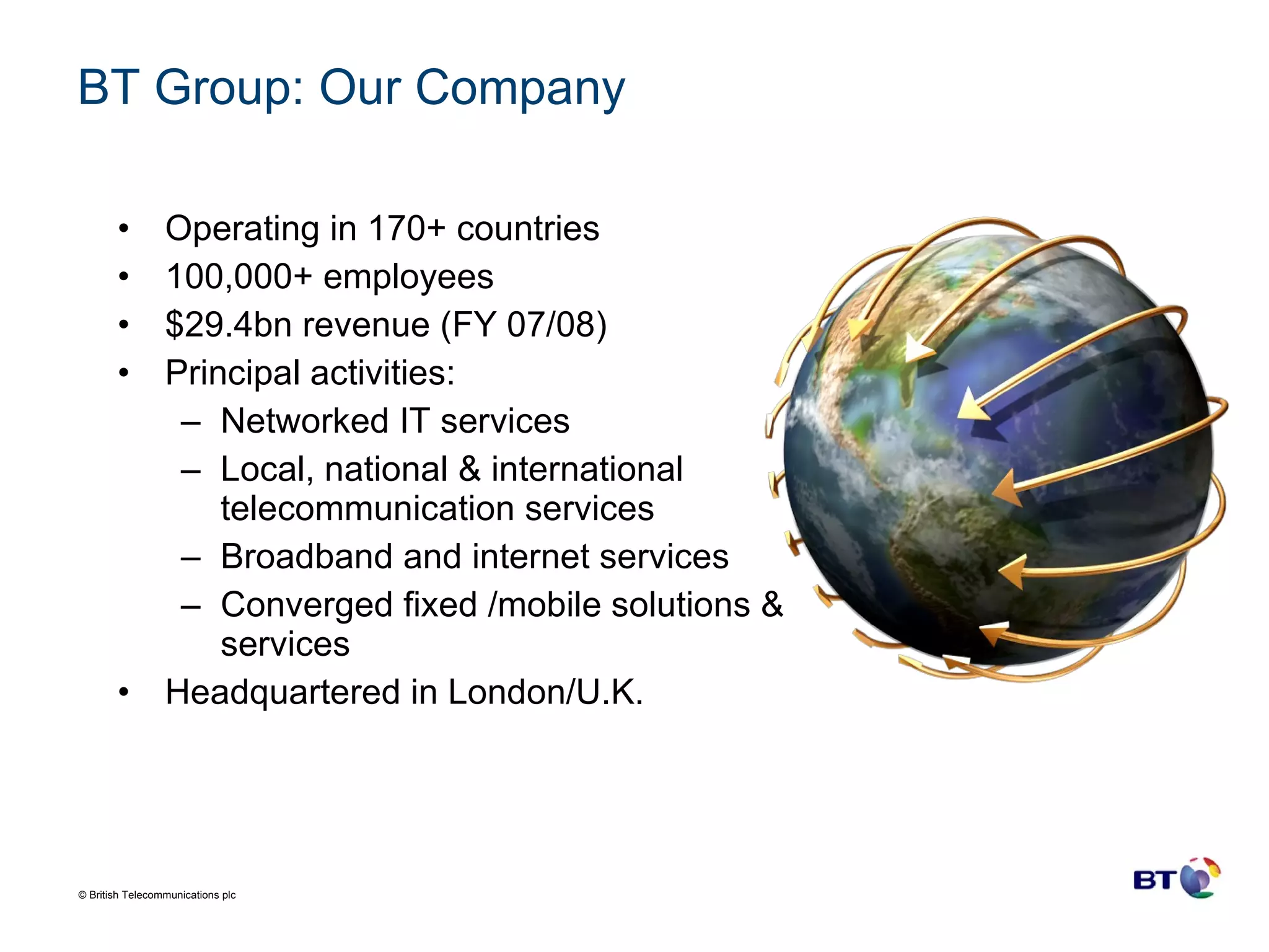 BT Group is a large telecommunications company operating in over 170 countries with over 100,000 employees and $29.4 billion in revenue. Over time, BT Group has transformed its finance organization through the increased use of shared service organizations (SSOs) and outsourcing to drive efficiency. BT Group established its first SSO in the UK in 2001 for transaction processing and IT support and has since expanded its SSOs globally and outsourced more finance functions. Technology has been a key enabler of BT Group's finance transformation, underpinning the organizational changes and alignment of SSOs and outsourcing to reduce costs and drive performance towards best-in-class.