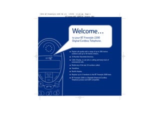 This user guide provides instructions for setting up and using the BT Freestyle 2200 cordless telephone. The guide includes information on location and setup of the base unit and handset, an overview of the buttons and menus, and instructions for basic functions like making calls, using caller ID, the quickdial directory, and registering additional handsets. It also includes troubleshooting tips, safety information, and specifications.