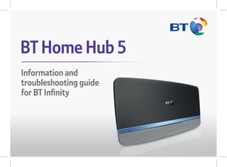 The document provides information and troubleshooting steps for connecting to and setting up a BT Infinity broadband connection using a BT Home Hub 5 wireless router. It outlines how to connect devices to the wireless network, set up services using Smart Setup on mybt.bt.com, and troubleshoot issues like checking cable connections if the power light is not blue. It also provides tips for optimizing wireless performance and using dual-band wireless frequencies.