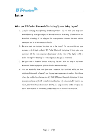 The document is a user guide for the BT-Pusher Bluetooth Marketing System, which utilizes Bluetooth technology to send marketing materials like leaflets and coupons to nearby customers' phones. The guide outlines the system's features such as automatically searching for and sending files to multiple Bluetooth devices simultaneously, supported file formats, and typical use cases in locations like shops, hotels and exhibitions. It also provides instructions, illustrations and answers to frequently asked questions about using the system.
