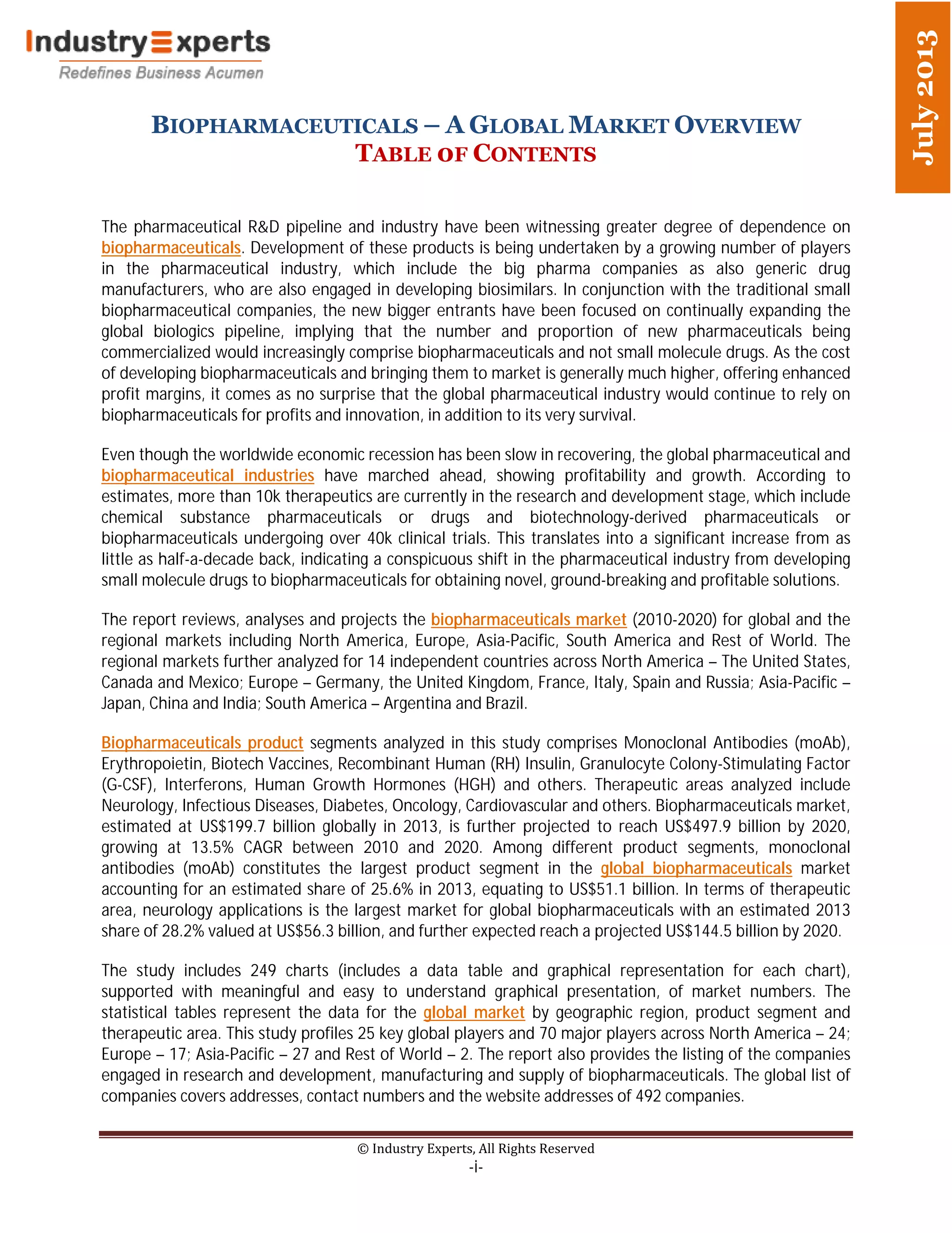 The document provides a comprehensive analysis of the biopharmaceutical market, detailing its significant growth and the increasing reliance on biopharmaceuticals within the global pharmaceutical industry. It outlines the current R&D pipeline, forecasts market growth from $199.7 billion in 2013 to $497.9 billion by 2020, and highlights key product segments such as monoclonal antibodies and therapeutic areas like neurology and oncology. The report also profiles major global players and discusses trends in investment, outsourcing, and the evolving landscape of biopharmaceutical development.