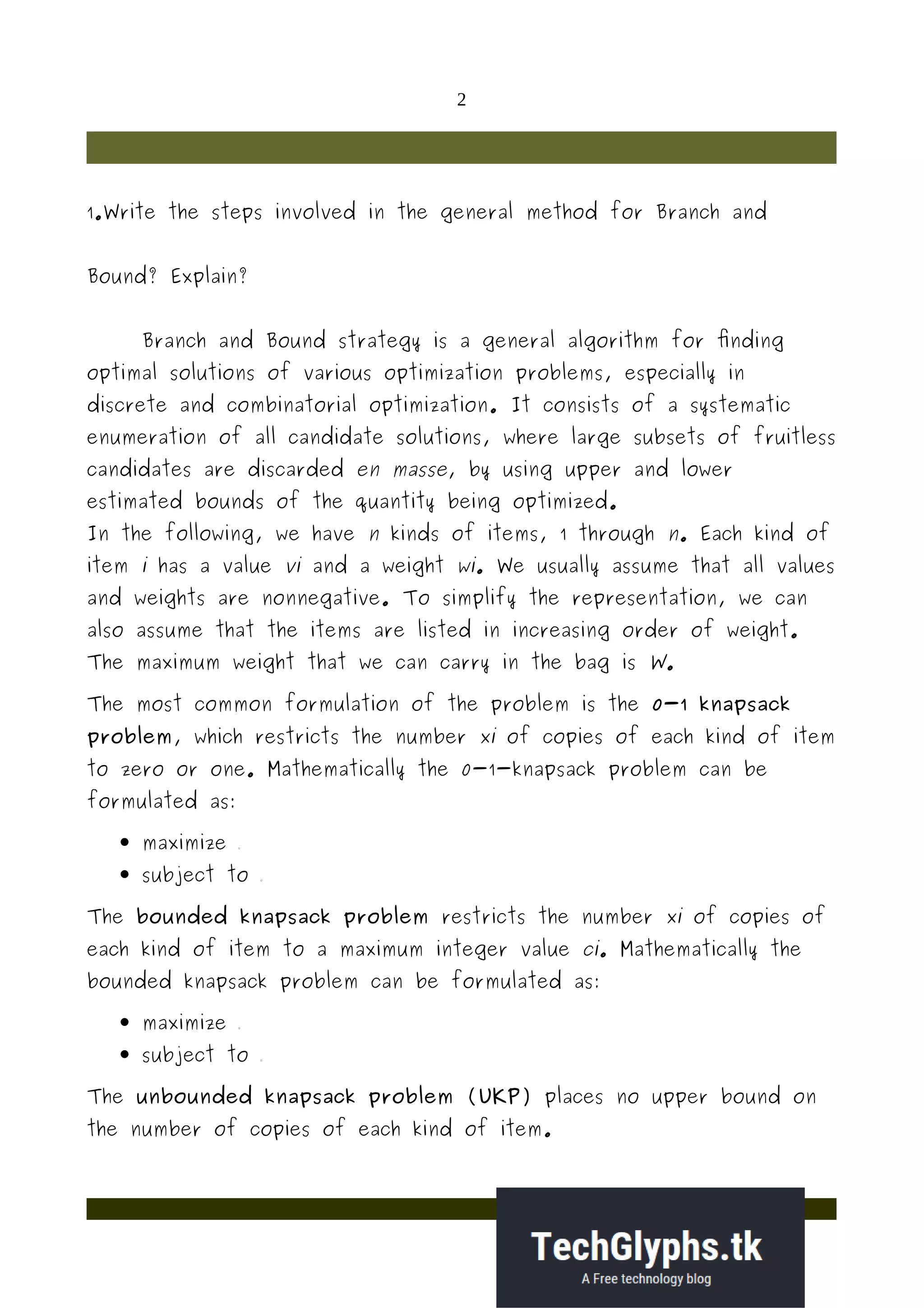 1) Branch and bound is an algorithm that systematically enumerates candidate solutions by discarding subsets that are provably suboptimal. The knapsack problem is used as an example problem.