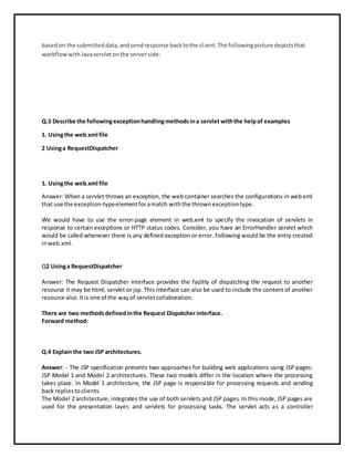 The document provides detailed information about server-side programming, focusing on concepts such as web servers, application servers, and servlet methods used for handling HTML form data. It outlines exception handling in servlets, discusses JSP architectures, and describes the lifecycle of JavaServer Faces pages. Additionally, it includes instructions for students to submit their assignments through email or phone.