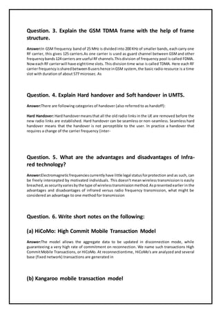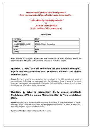 The document contains information regarding assignments for BSc IT students focusing on mobile computing, including specific questions and their evaluation schemes. Key topics include the differences between wireless and mobile communication, modulation types, GSM TDMA frames, hard and soft handovers in UMTS, and advantages of infrared technology. Students are encouraged to send their semester details via email or call for assistance with their assignments.