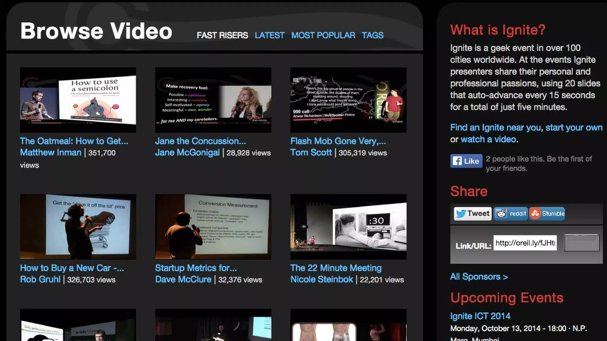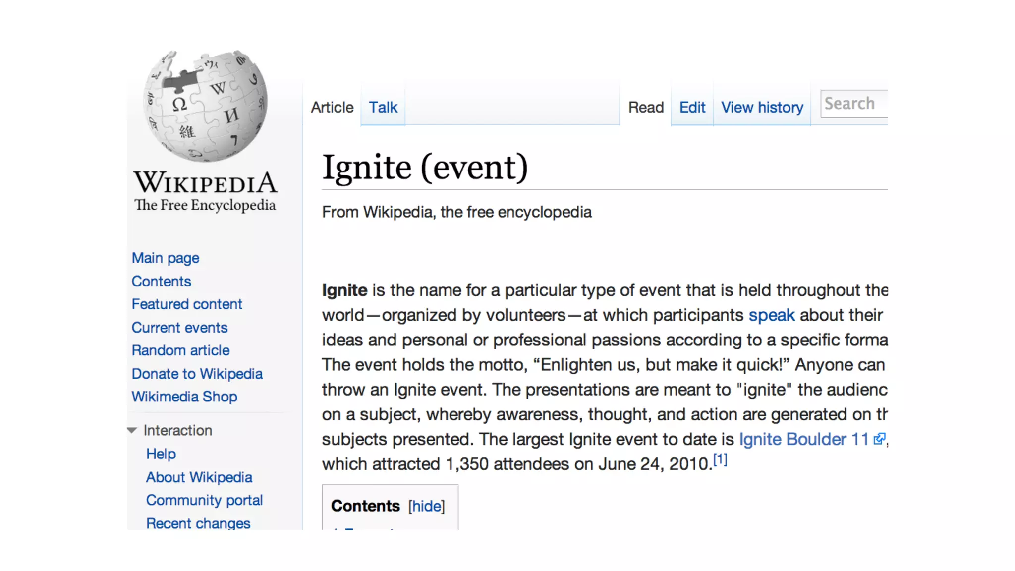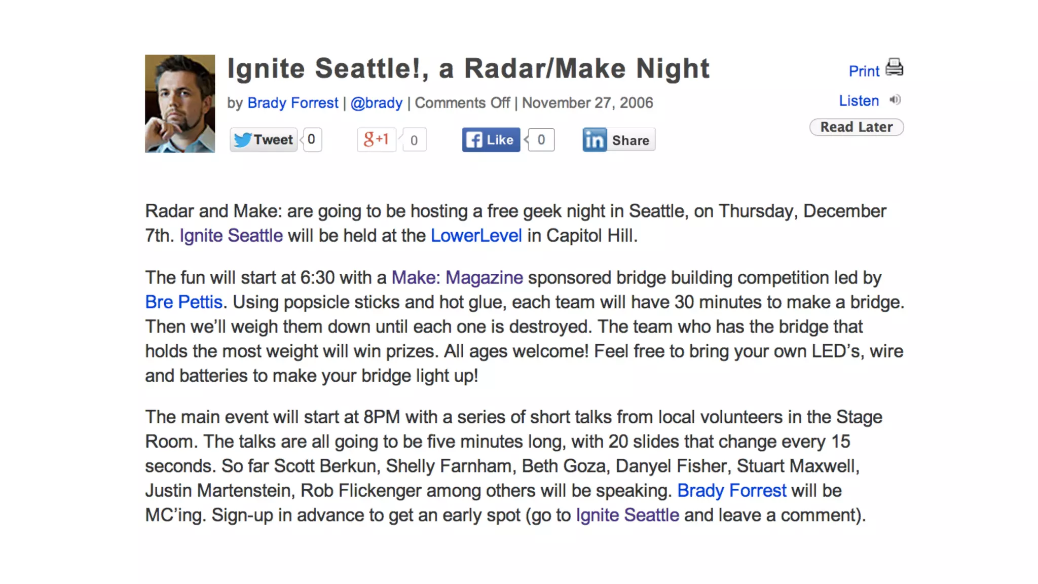 The document references a series of talks and ideas shared by various speakers at an event, emphasizing creativity, growth, and collaboration. Key themes include using social media effectively, inviting engagement, and the importance of constraints in defining projects. The format is fast-paced, with quick presentations designed to enlighten the audience in a concise manner.