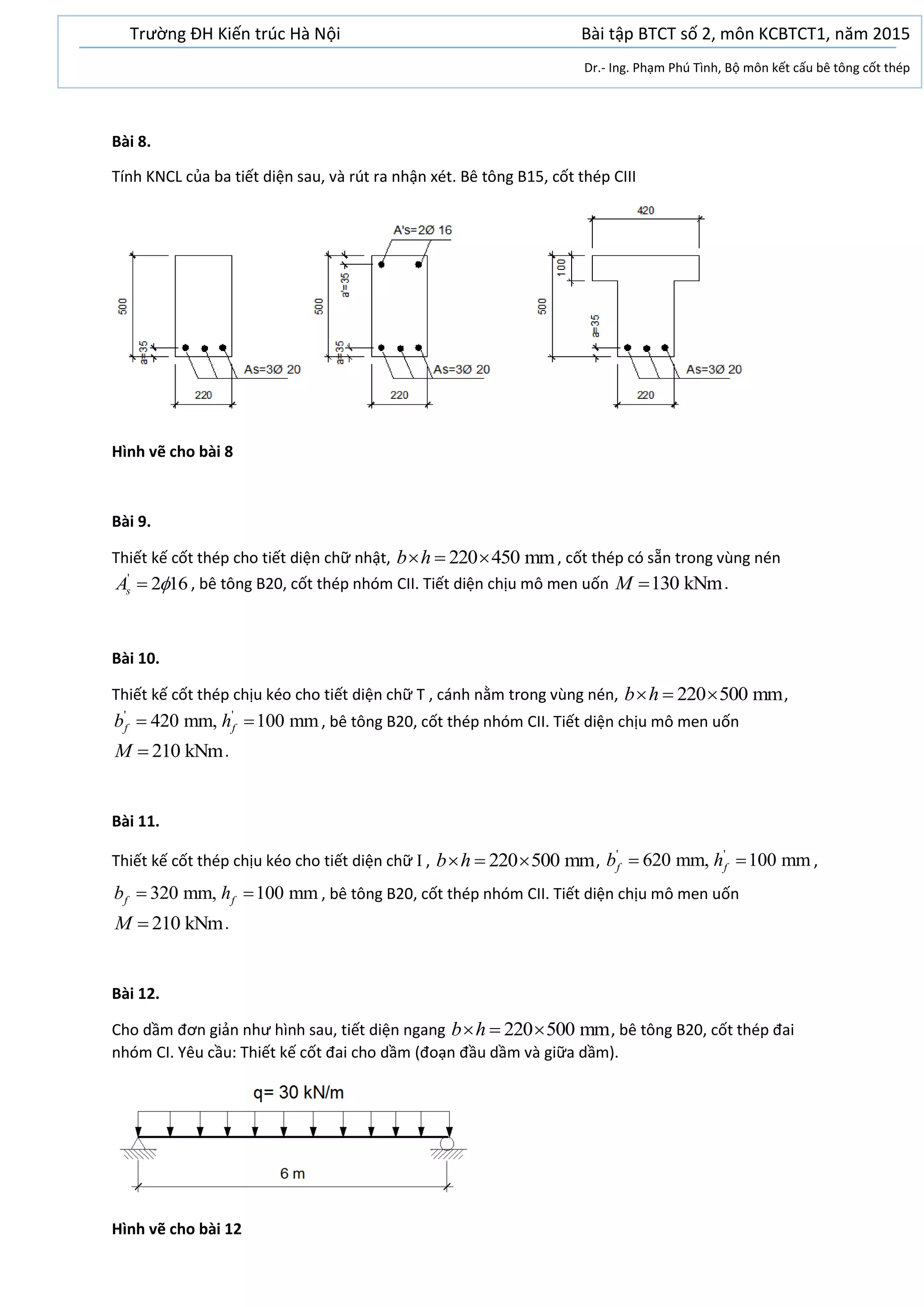 Tài liệu trình bày các bài tập thiết kế cốt thép và tính toán cho các tiết diện bê tông khác nhau, bao gồm tiết diện chữ nhật, chữ T và chữ I với bê tông B15 và B20 cùng cốt thép các nhóm khác nhau. Các bài tập này yêu cầu thiết kế cốt đai và chịu mô men uốn trong các điều kiện cụ thể. Nội dung cũng đề cập tới việc bố trí cốt thép cho dầm đơn giản và yêu cầu nộp bài viết tay.