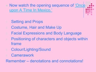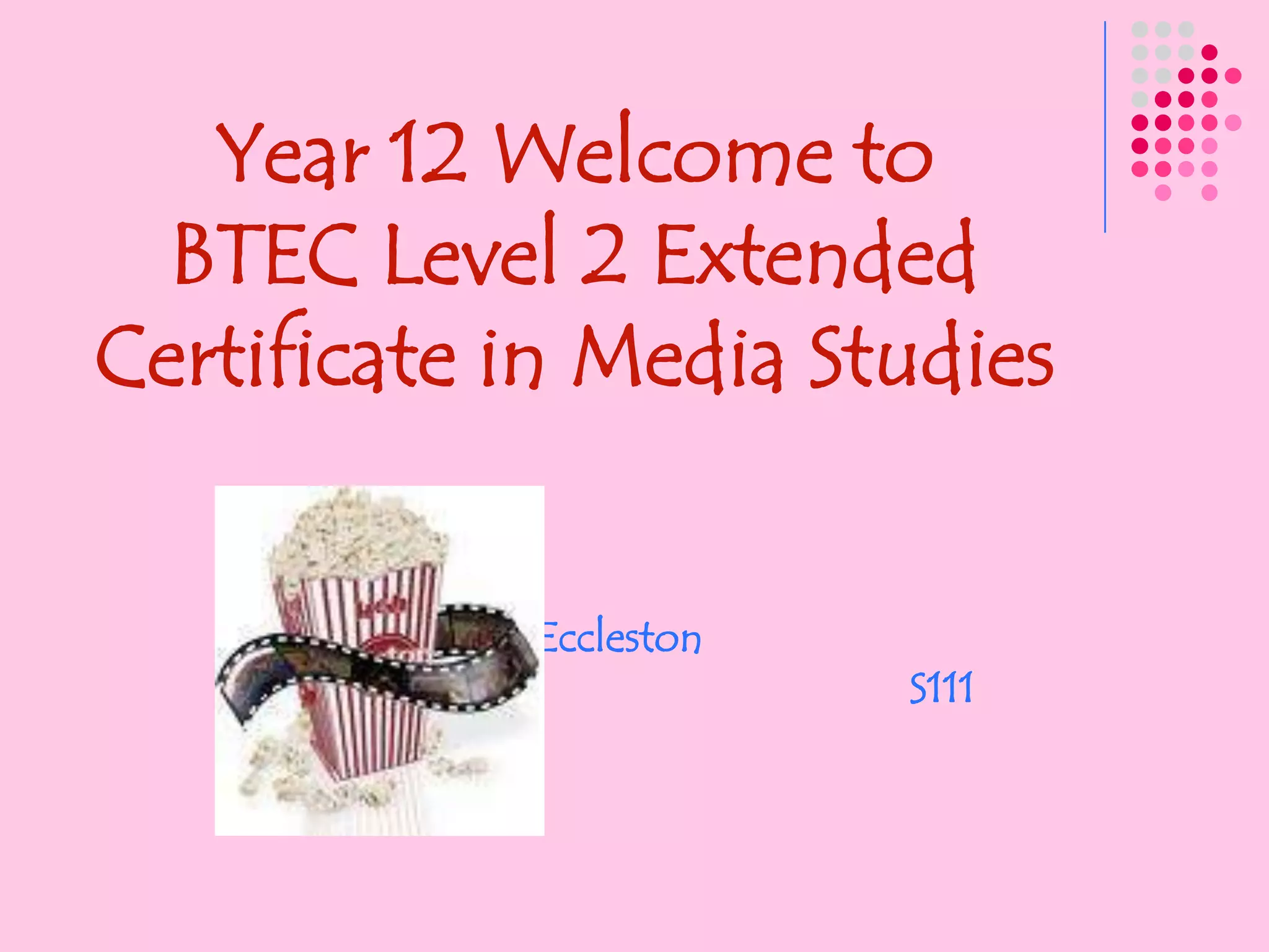This document provides an overview of the BTEC Level 2 Extended Certificate in Media Studies course for Year 12 students. It outlines the units to be covered, including video production, research for creative media, audio production, and communication techniques. It discusses assessment criteria, required qualities for success on the course, and homework expectations. Students are asked to research openings to four Western films in preparation for an analysis of mise-en-scene conventions.