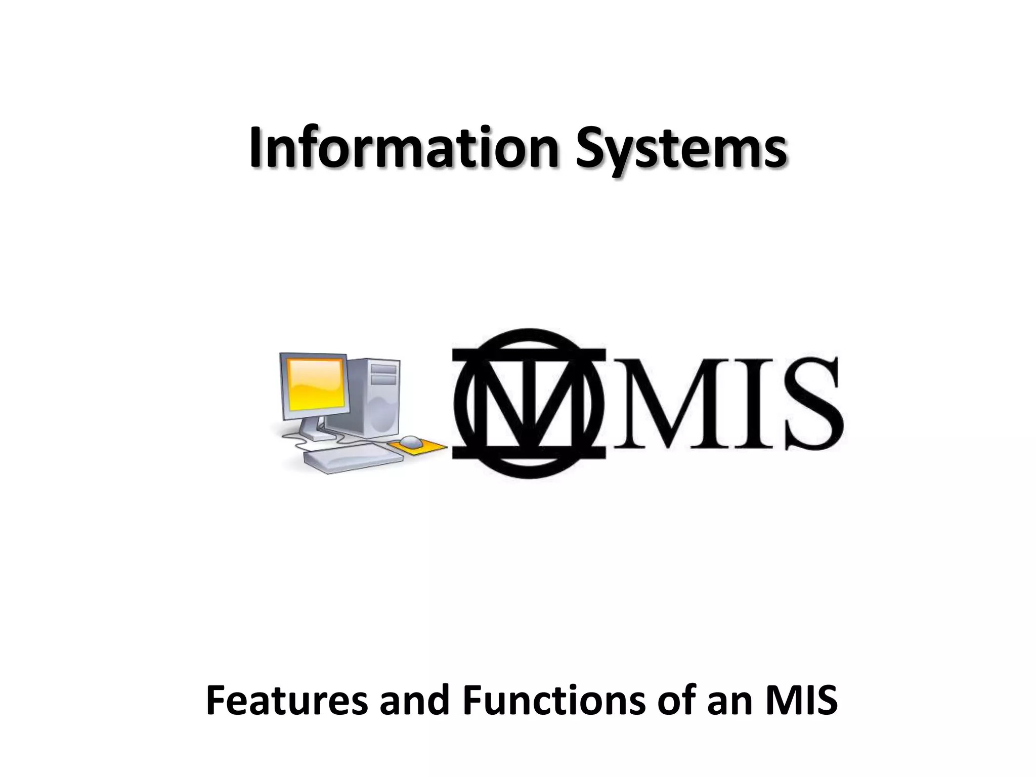 An information system has four main functions: input, storage, processing, and output. There is often a feedback loop so the system output can affect future input. An information system takes in detailed data through input, stores and processes it, and produces output information. The output can then provide feedback to users to influence future inputs into the system and analyses requested. Key elements that make up an information system include data, people, hardware, software, and telecommunications infrastructure.