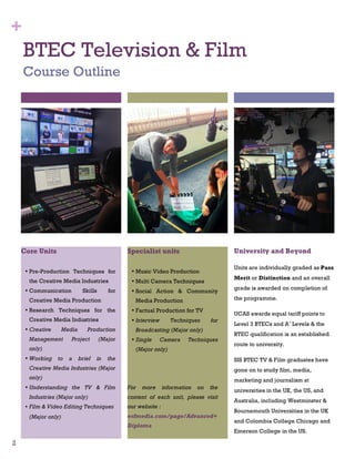 The BTEC Level 3 National Diploma in Creative Media Production (TV & Film) is a 1-2 year course equivalent to 1-2 A-levels that provides skills for a career in media. Students gain practical experience through developing films and working with industry professionals. The course covers units in pre-production, communication, research, production management, and film/TV industries. Work experience is also required. Graduates have gone on to study media-related degrees at universities around the world.