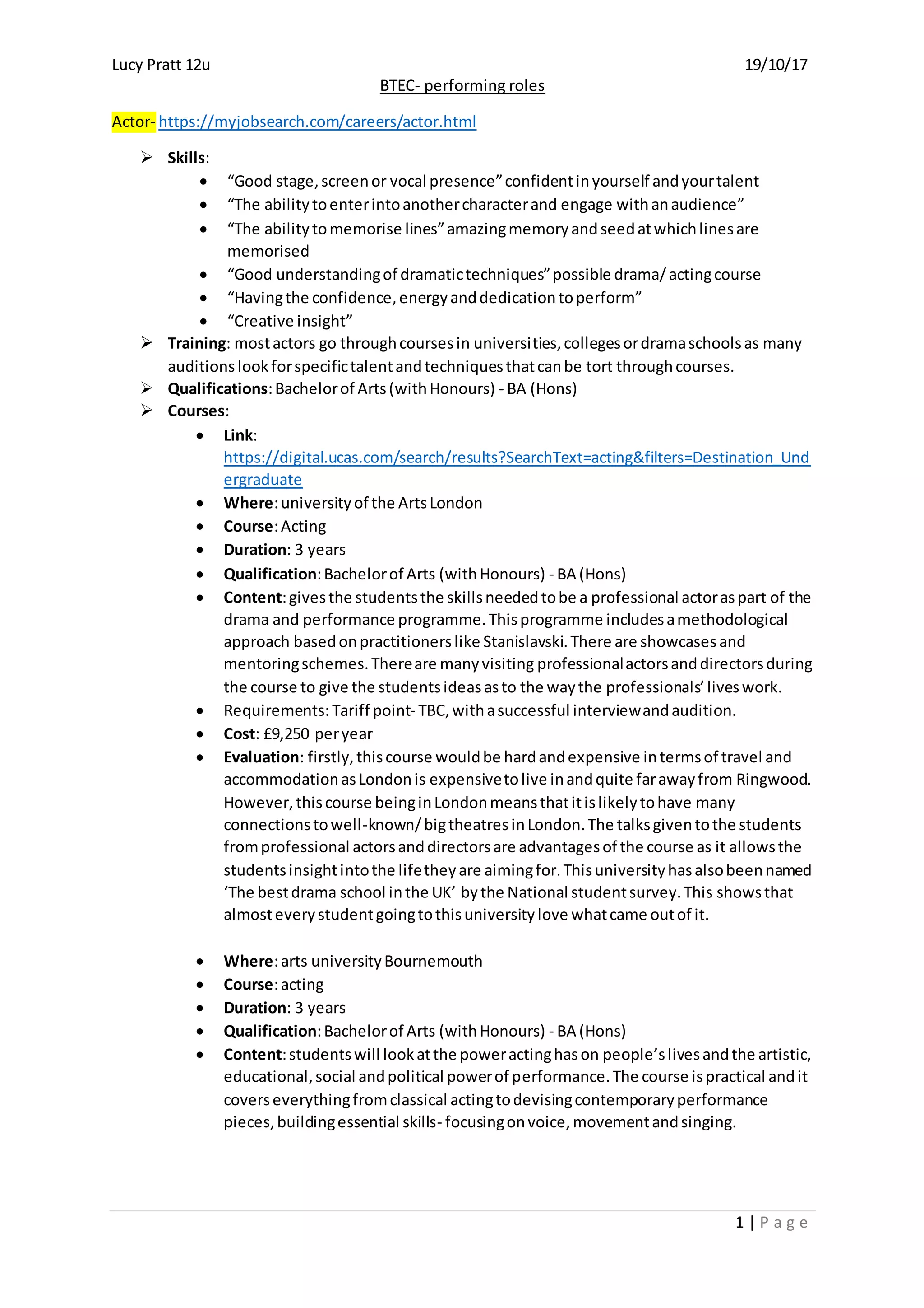 The document provides information on potential career paths and training options for actors, dancers, and singers. It describes the skills required for each role, including confidence, creativity, and strong performance abilities. Typical training involves drama school or university degrees in relevant subjects like performing arts. Example courses listed include acting, dance, and musical theatre degrees from universities around the UK. Admission typically requires previous qualifications and auditions. Challenges of each career are also noted, such as the competitive nature of work and short career spans in some performance areas.