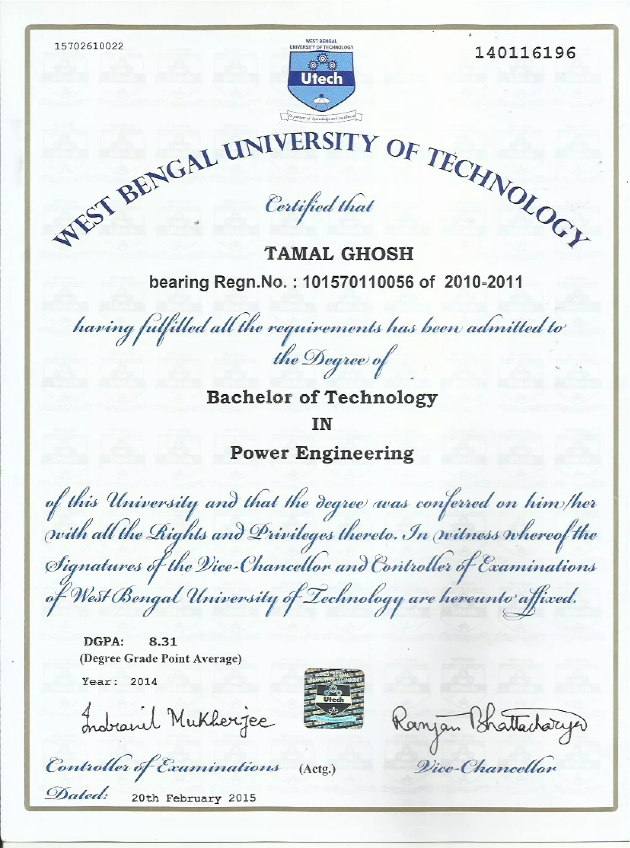 B.Tech degree certificate