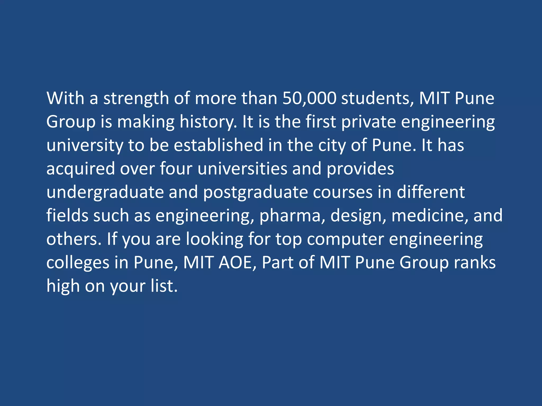 MIT AOE, the first private engineering university in Pune, offers a B.Tech in Computer Science Engineering with a focus on Artificial Intelligence and Machine Learning. The program emphasizes research-based learning, practical exposure, and a curriculum aligned with market needs, preparing students for competitive careers and entrepreneurship. With robust placement support and a vibrant student life, MIT AOE aims for the holistic development of its students.
