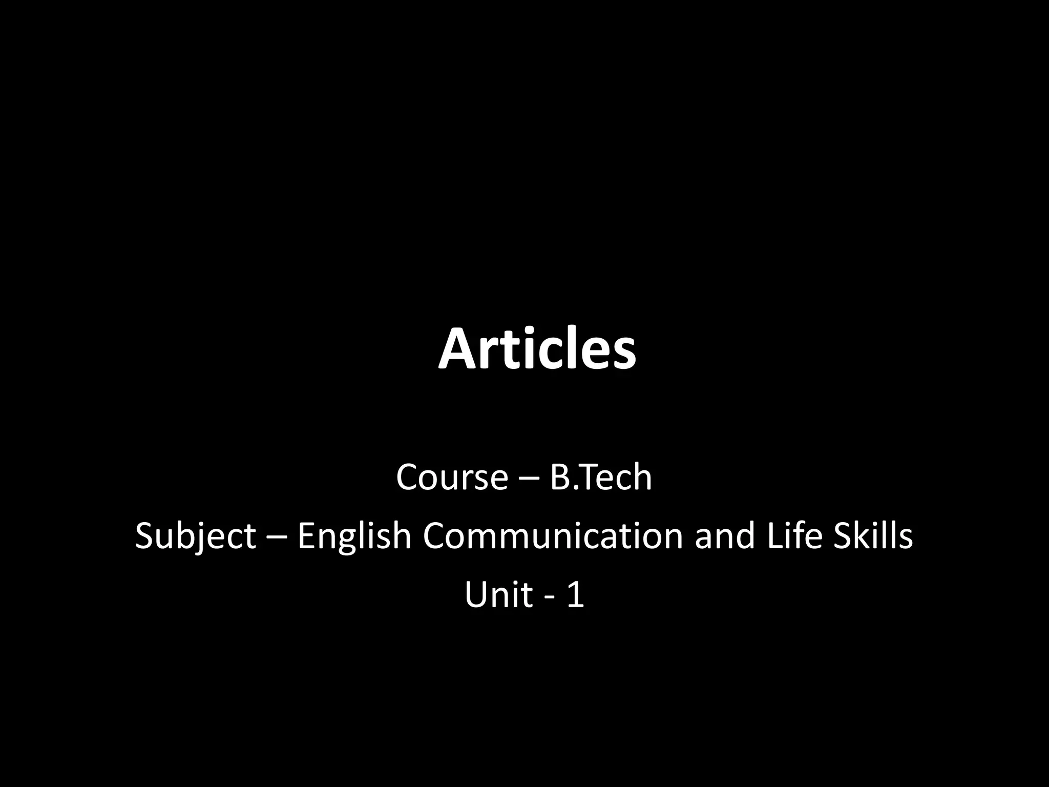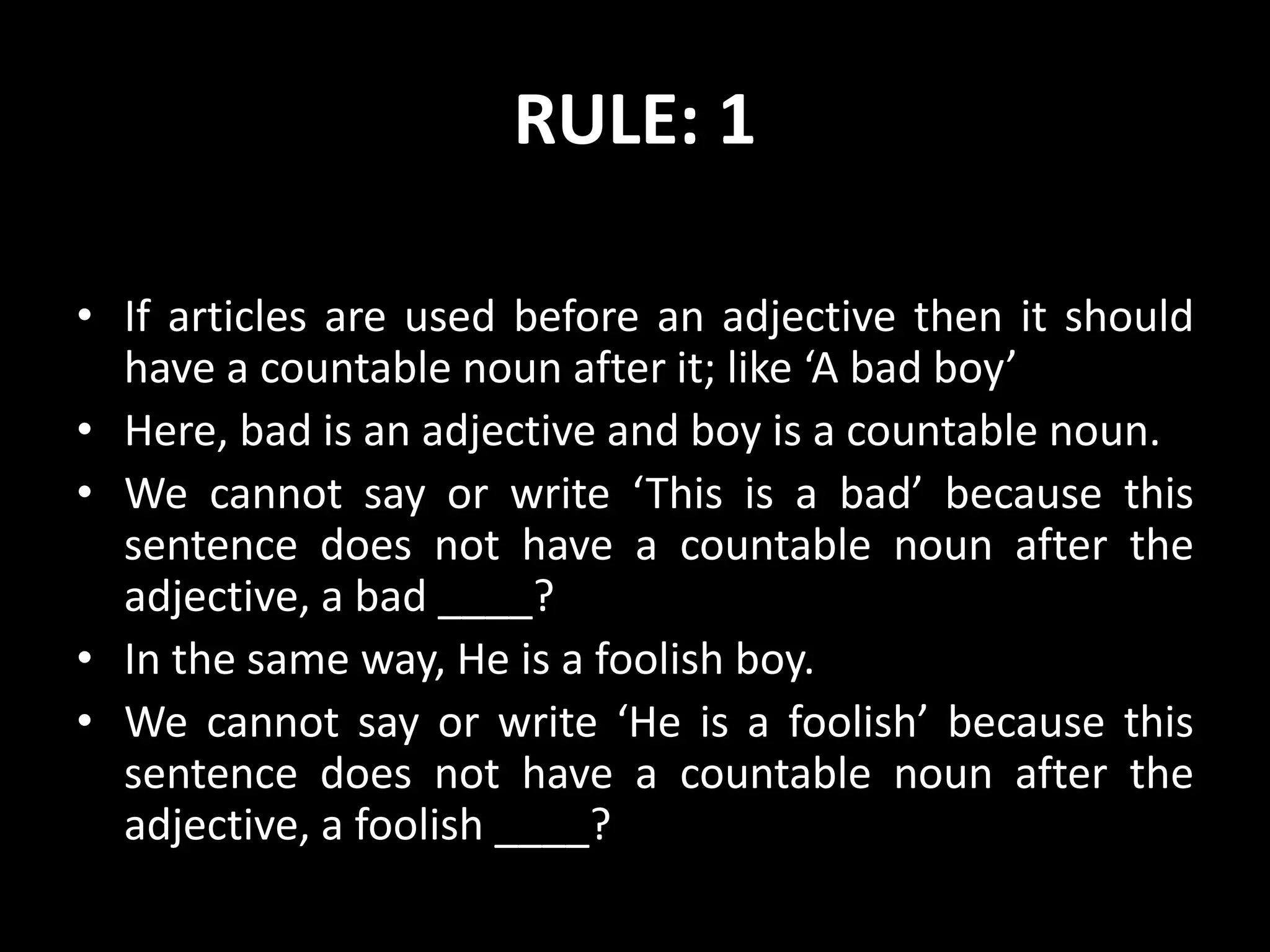 This document provides rules for using articles (a, an, the) in English sentences. It discusses when to use articles with countable nouns, singular vs. plural nouns, proper nouns, uncountable nouns, names of countries, languages, meals, years, days, and possessives. Examples are given for each rule and practice exercises provide opportunities to apply the rules by identifying whether sentences are true or false and correcting incorrect ones. Key aspects covered include using articles before adjectives when a countable noun follows, and not using articles in certain cases like with uncountable nouns, names, or possessives.