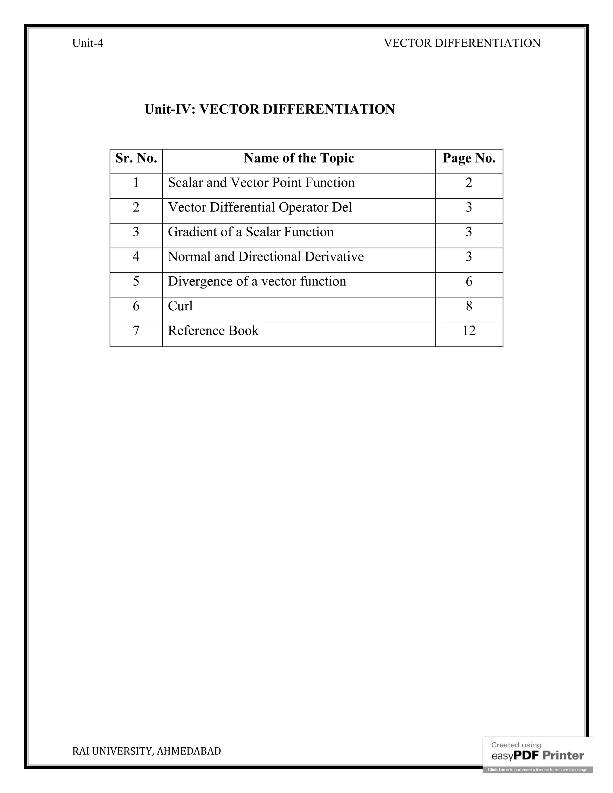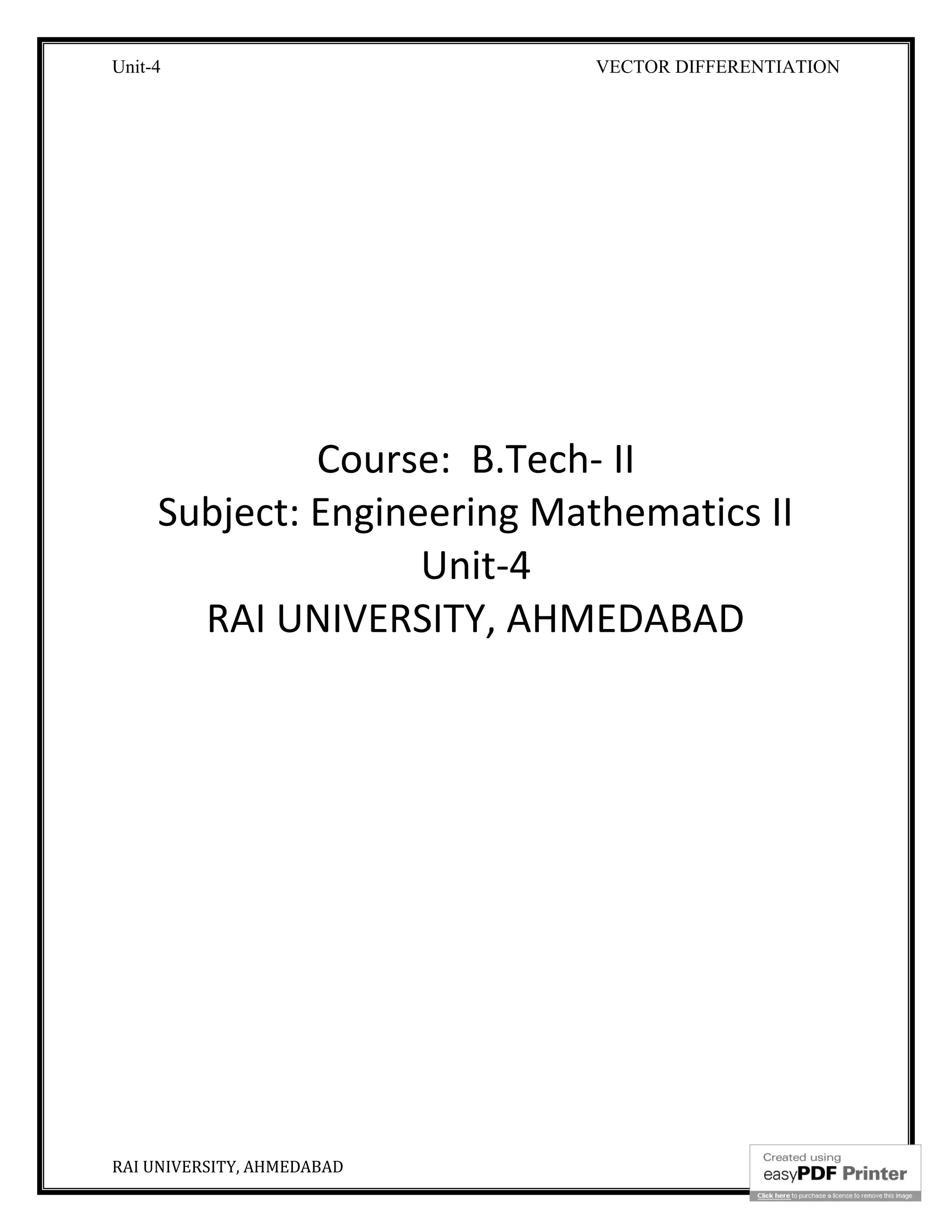 This document provides an overview of vector differentiation, including gradient, divergence, curl, and related concepts. It begins with definitions of scalar and vector point functions. It then defines the vector differential operator Del and explores using it to calculate the gradient of a scalar function, directional derivatives, and normal derivatives. The document also covers divergence and curl, providing their definitions and formulas. Examples are given for calculating gradient, divergence, curl, and directional derivatives. The document concludes with exercises and references for further reading.